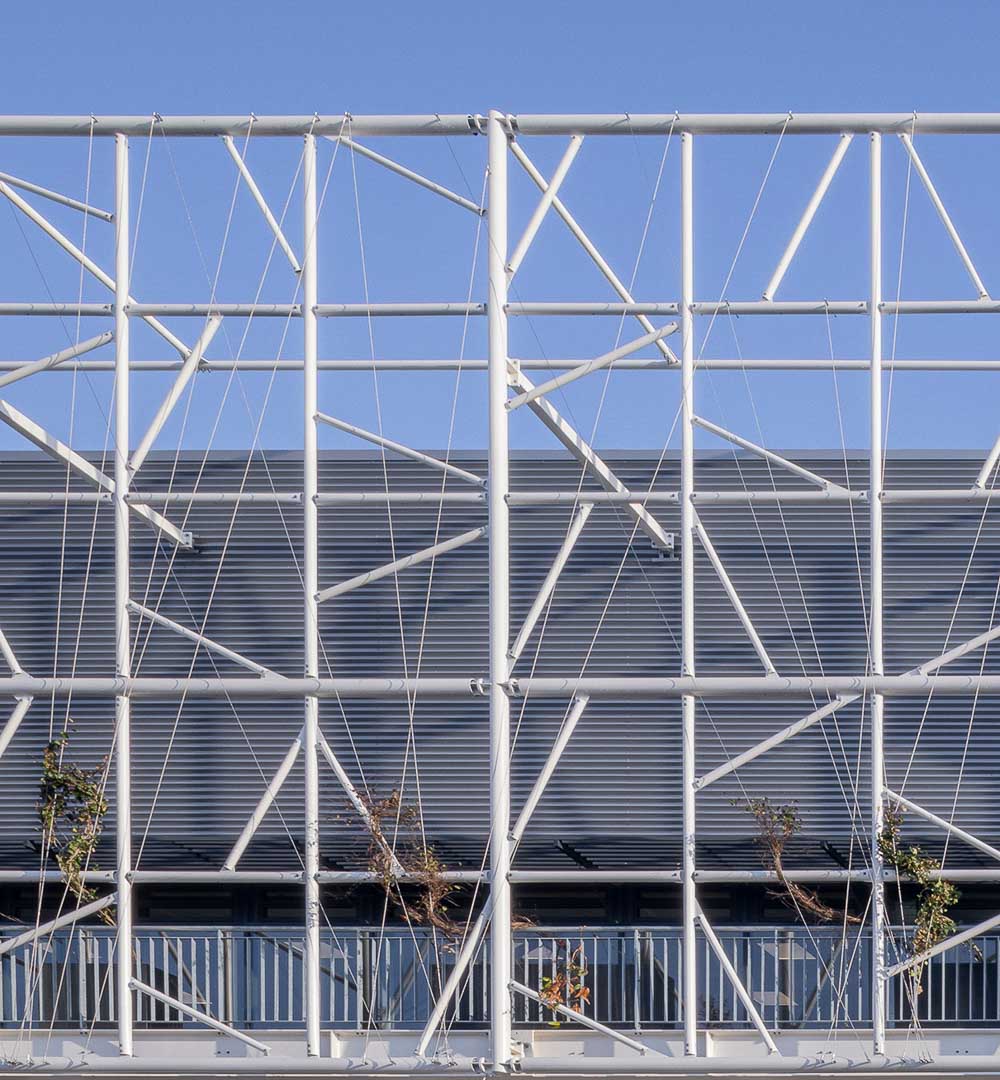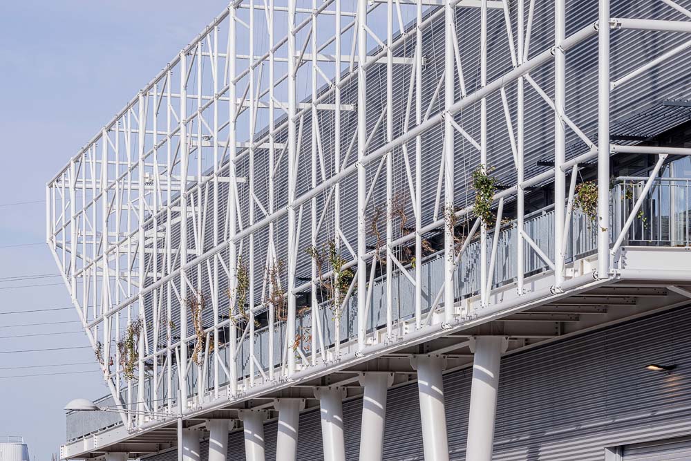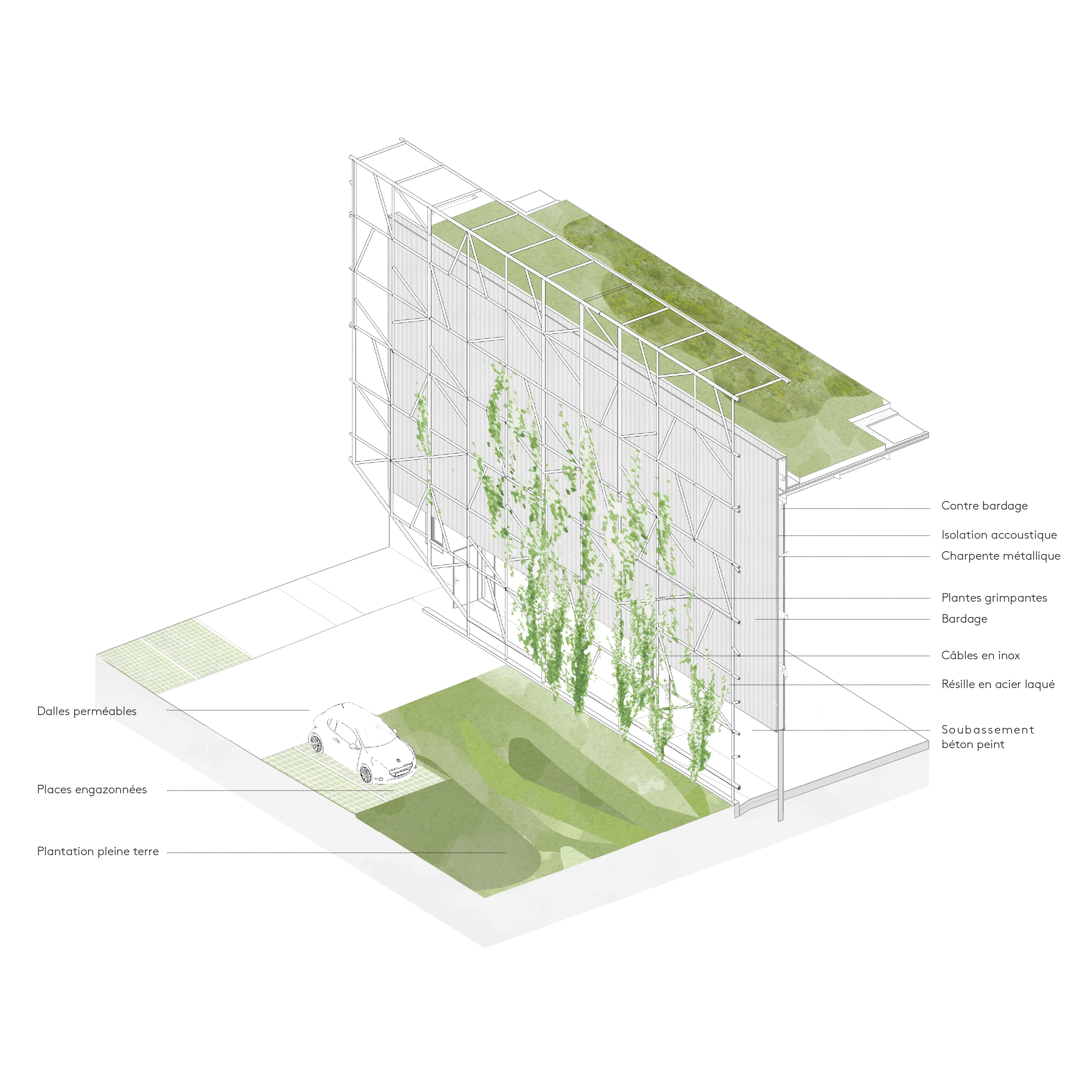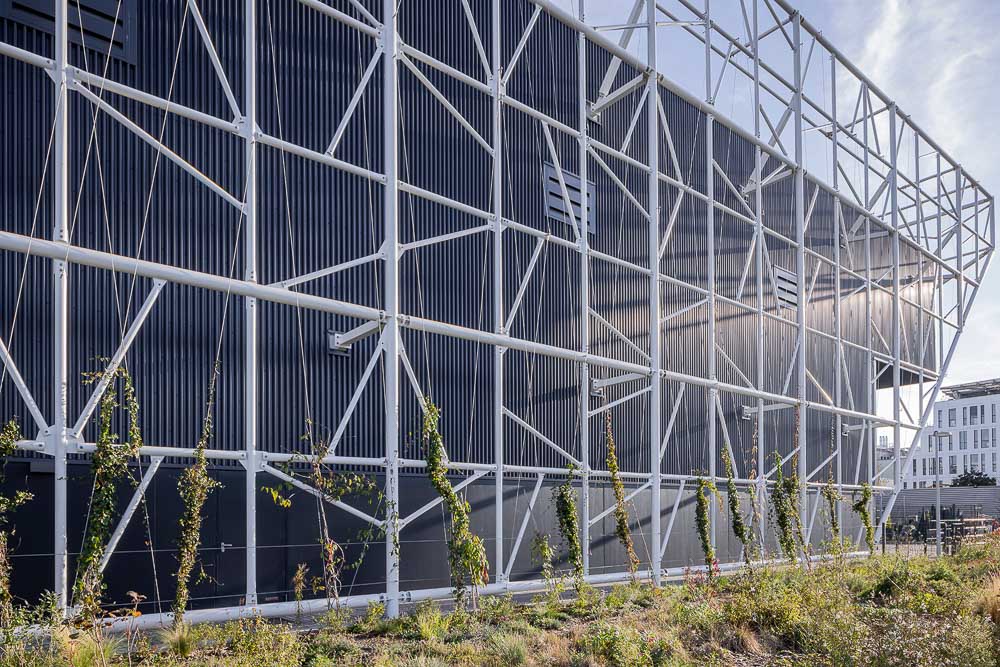 The mesh is the structuring element of the project, a balcony clings to it, the vegetation begins to climb there, it plays with the sun and draws large shadows on the facades, it is the coherence of the industrial tool.