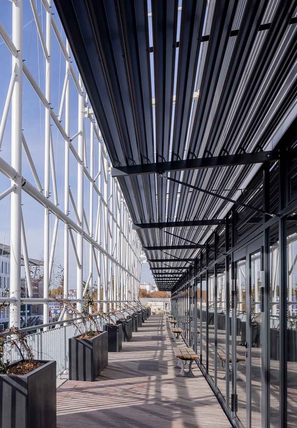 The presence of green spaces changing with the seasons, the penetration of natural light, the new exterior spaces and the new views created enhance the working conditions by offering a new relationship to the site and the landscape. Visual, acoustic and olfactory nuisances are dealt with at the scale of the building, for the comfort of the employees and for a softened urban impact.