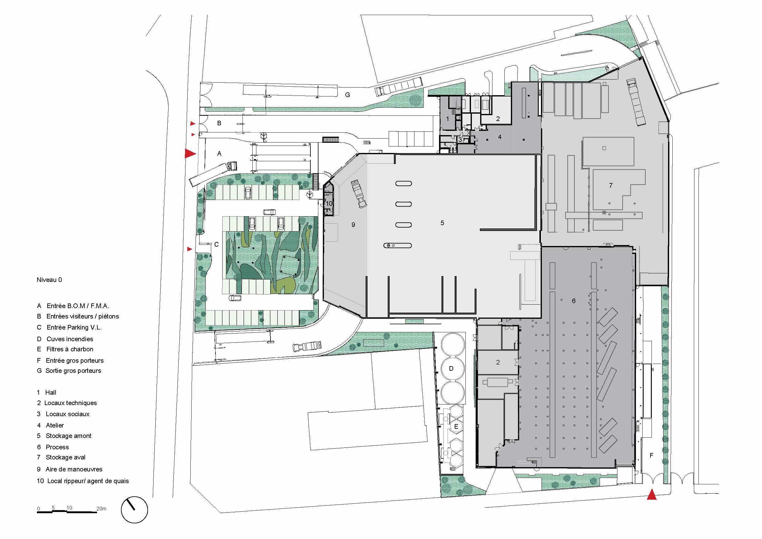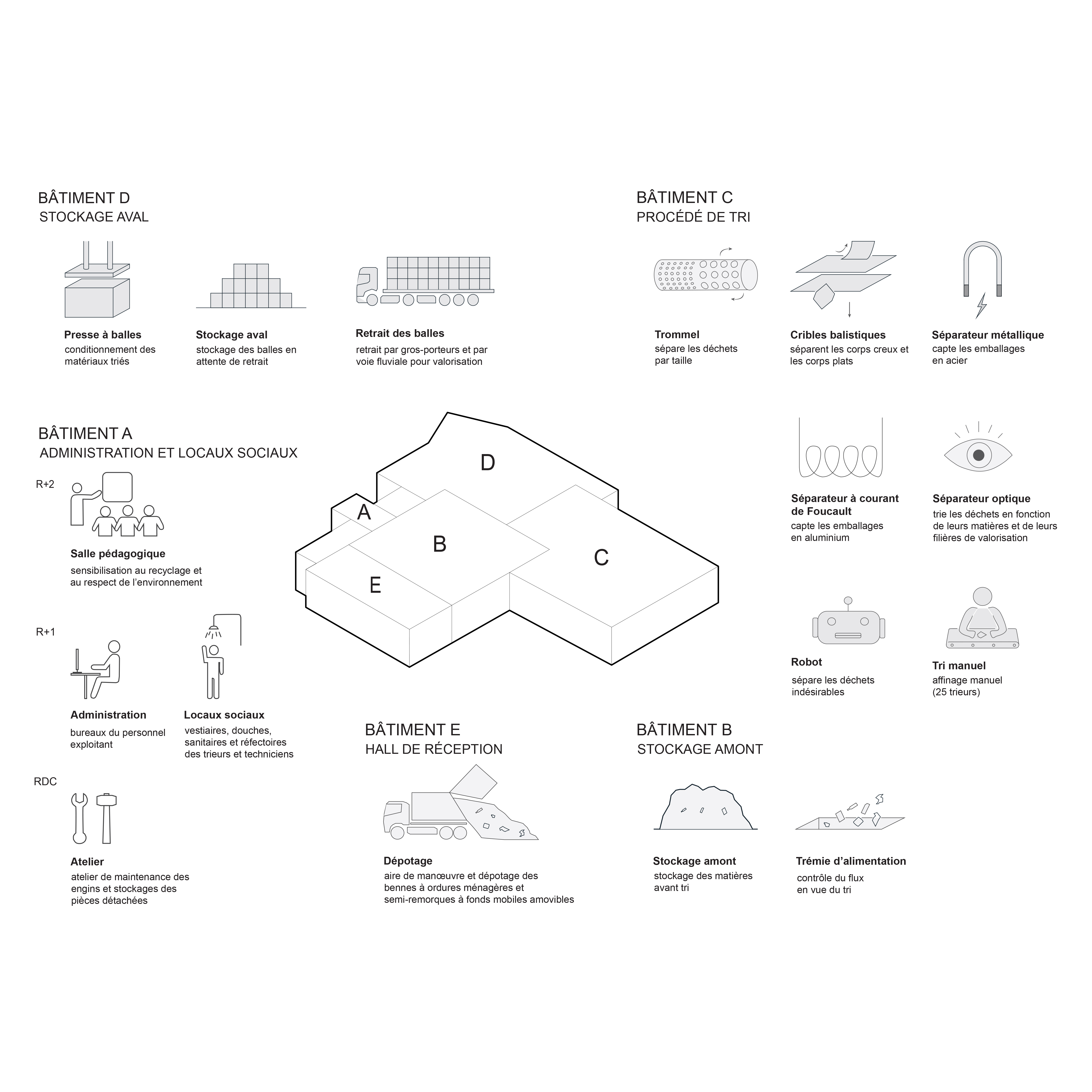 The volumetric principle of the center, adapted to the different functions, has been retained : building A houses the administrative and social premises and the workshops; buildings E, B, C and D, dumping, reception and storage of the material collected, sorting, packaging and evacuation of the sorted material. The restructuring of the vehicle access area and the material reception area required the demolition and reconstruction of Building E and the demolition of the small radioactive material isolation building.