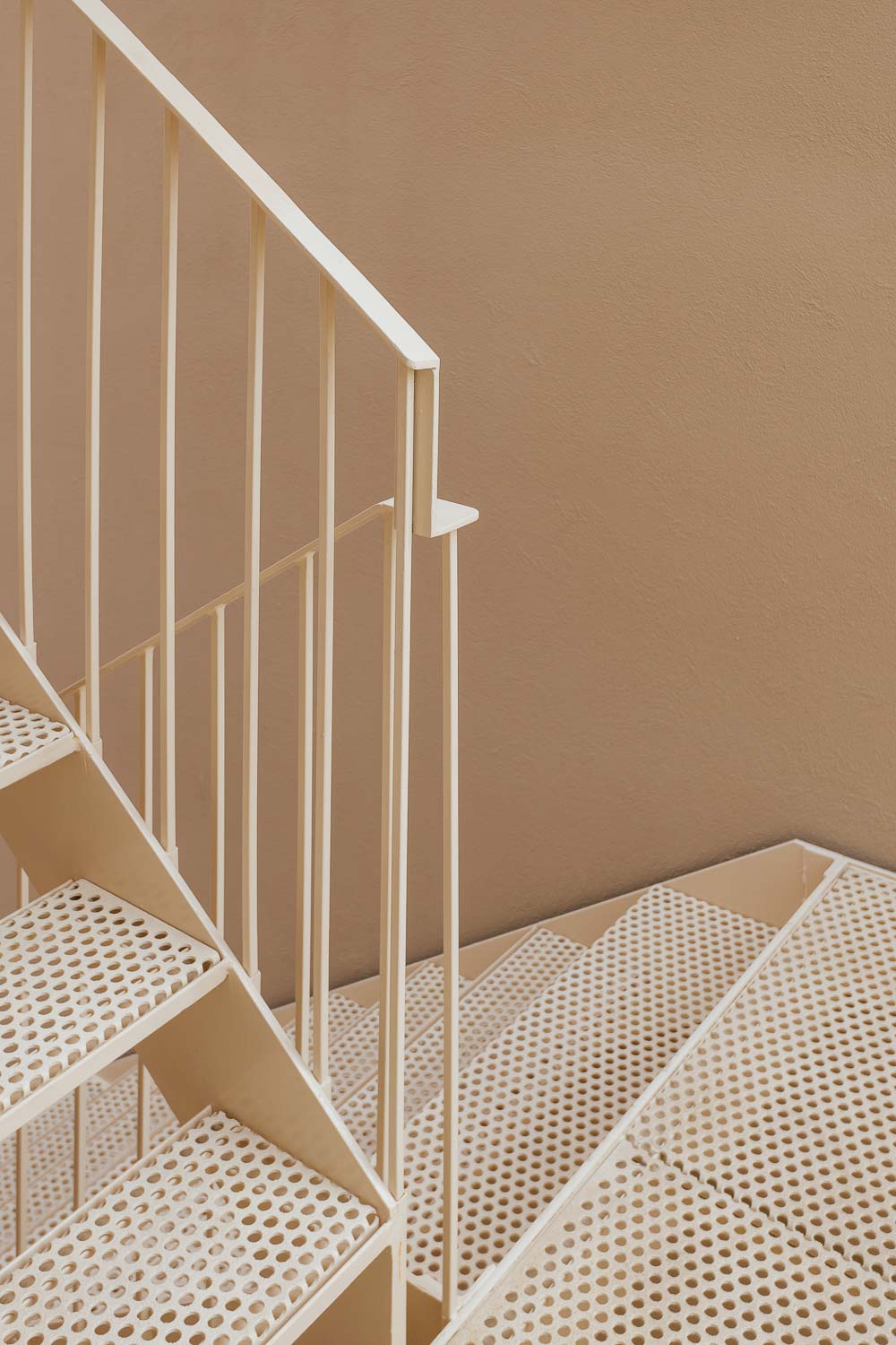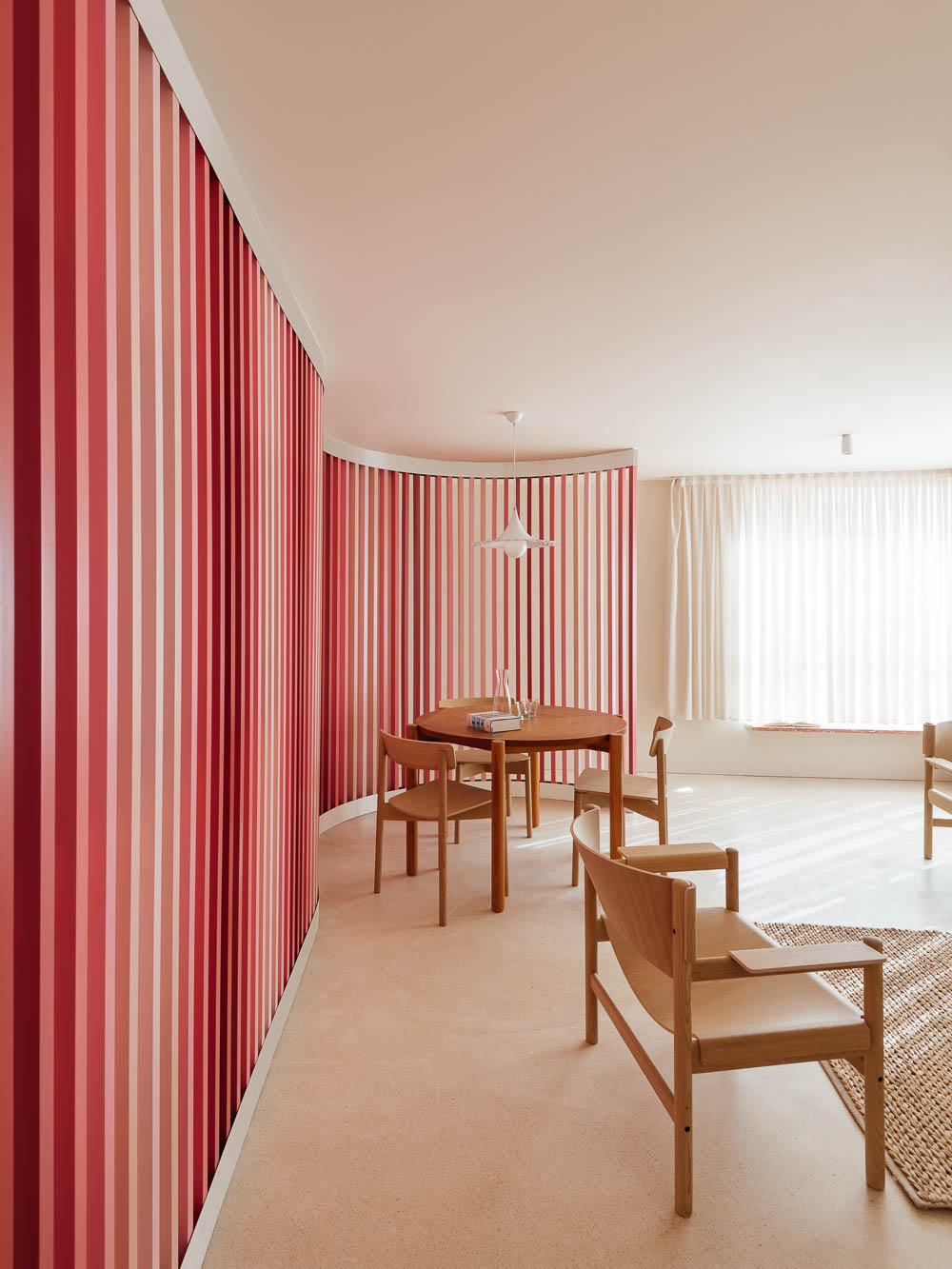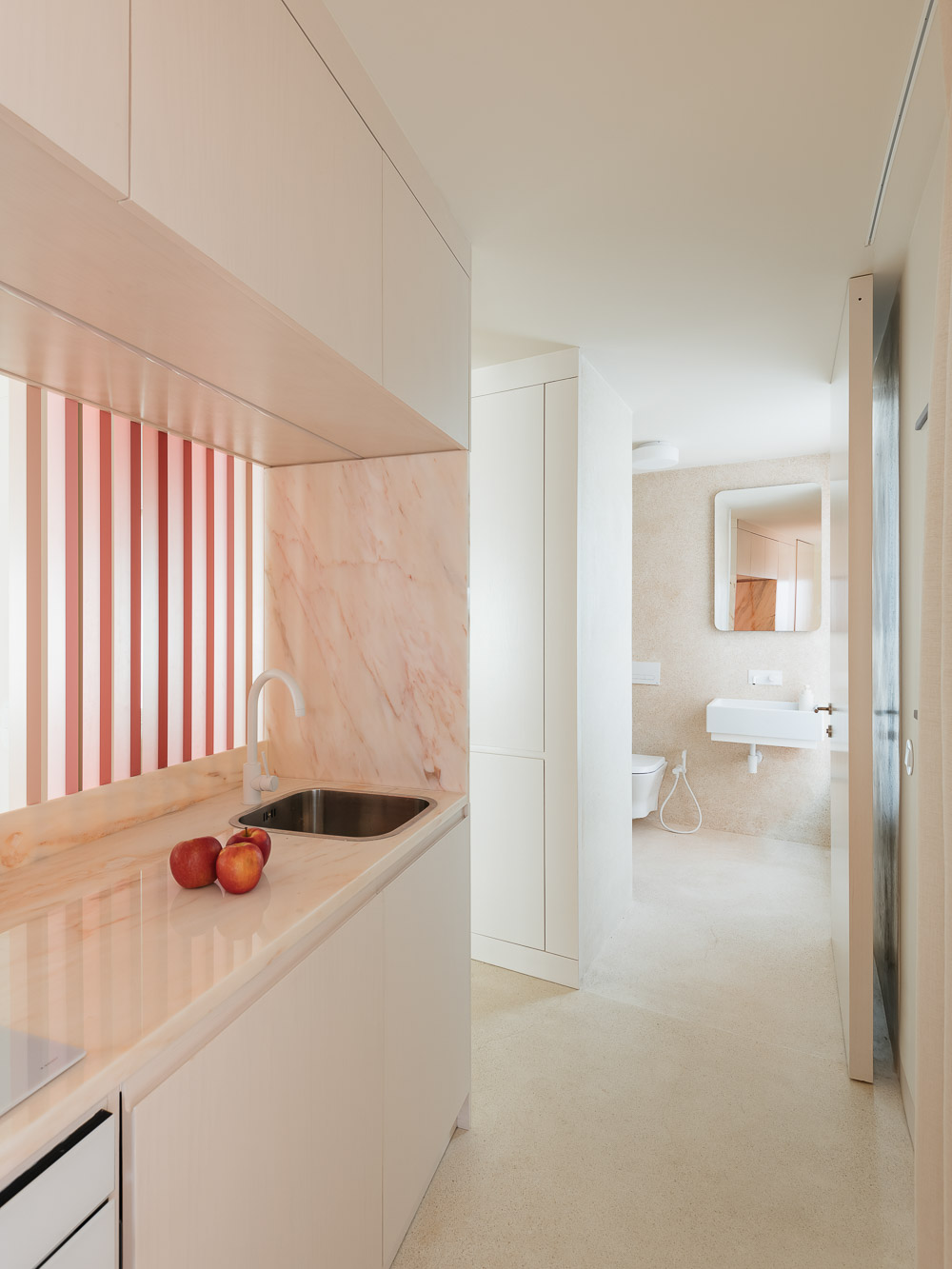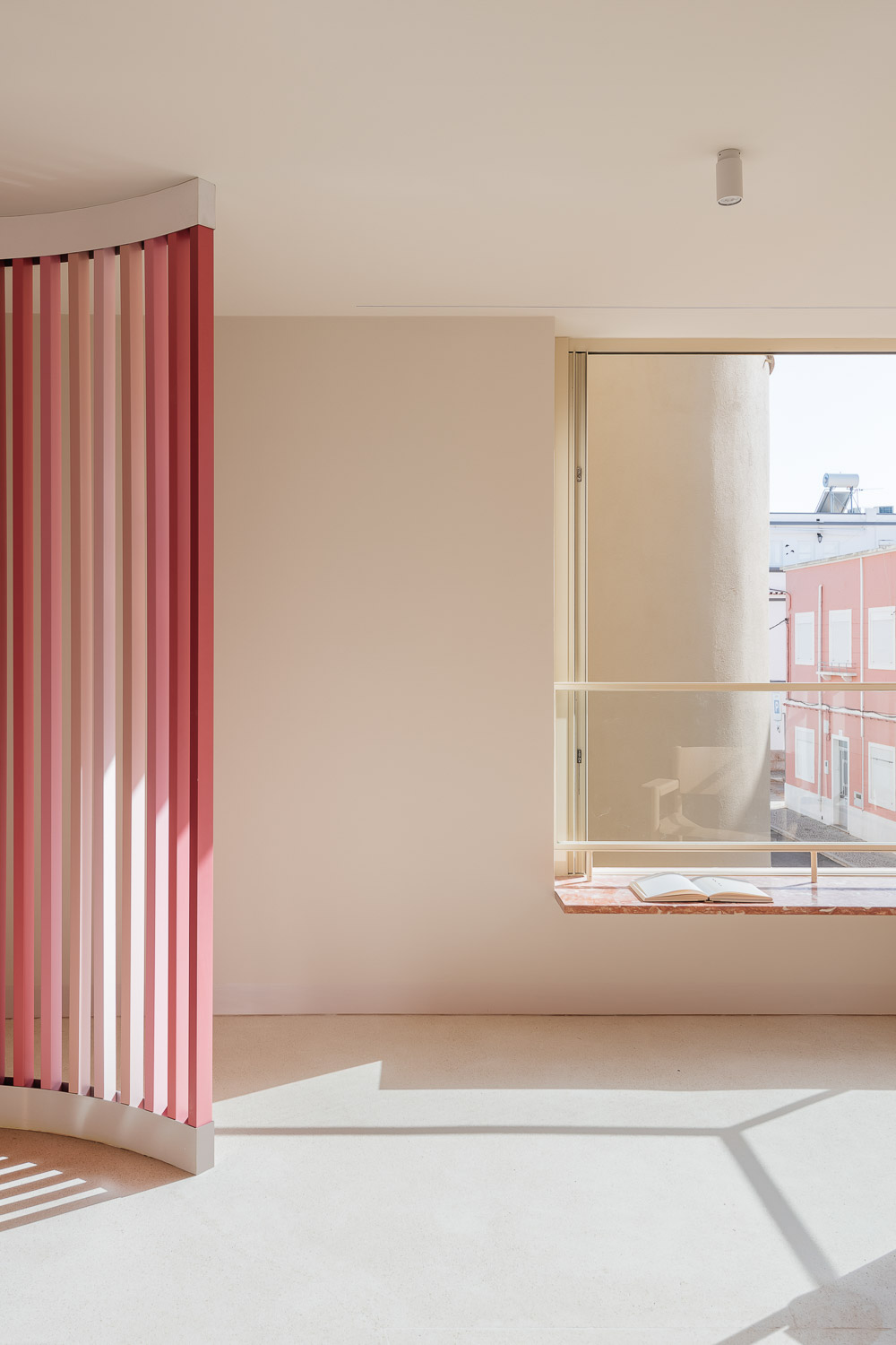 We took the challenge set by the regulations and we created a four-floor building divided in two to allow more light in the central patio. To improve the opportunities for social interaction and the common amenities of the residential complex, it was decided to use the last floor to locate a small swimming pool and a terrace for sunbathing. For the facade, we designed a set of one pane sliding windows out of alignment. The dimension of the windows and the ability to disappear inside the walls can transform the living rooms almost into outdoor terraces making the most of the weather of this region. For the interior, our option was to explore the opposite of the exotism of the existent building and design calm interiors similar in all the flats with wood and cream terrazzo. To this relaxing atmosphere, we added a bold element - an open partition of wood painted in a gradient of pink that organizes the social space of the flats and makes the chromatic connection with the beginning of this story: the rose building, that now is mustard-rose.