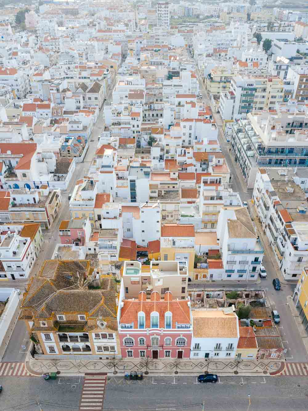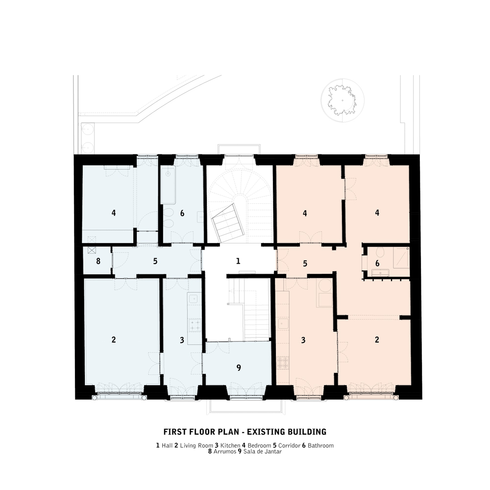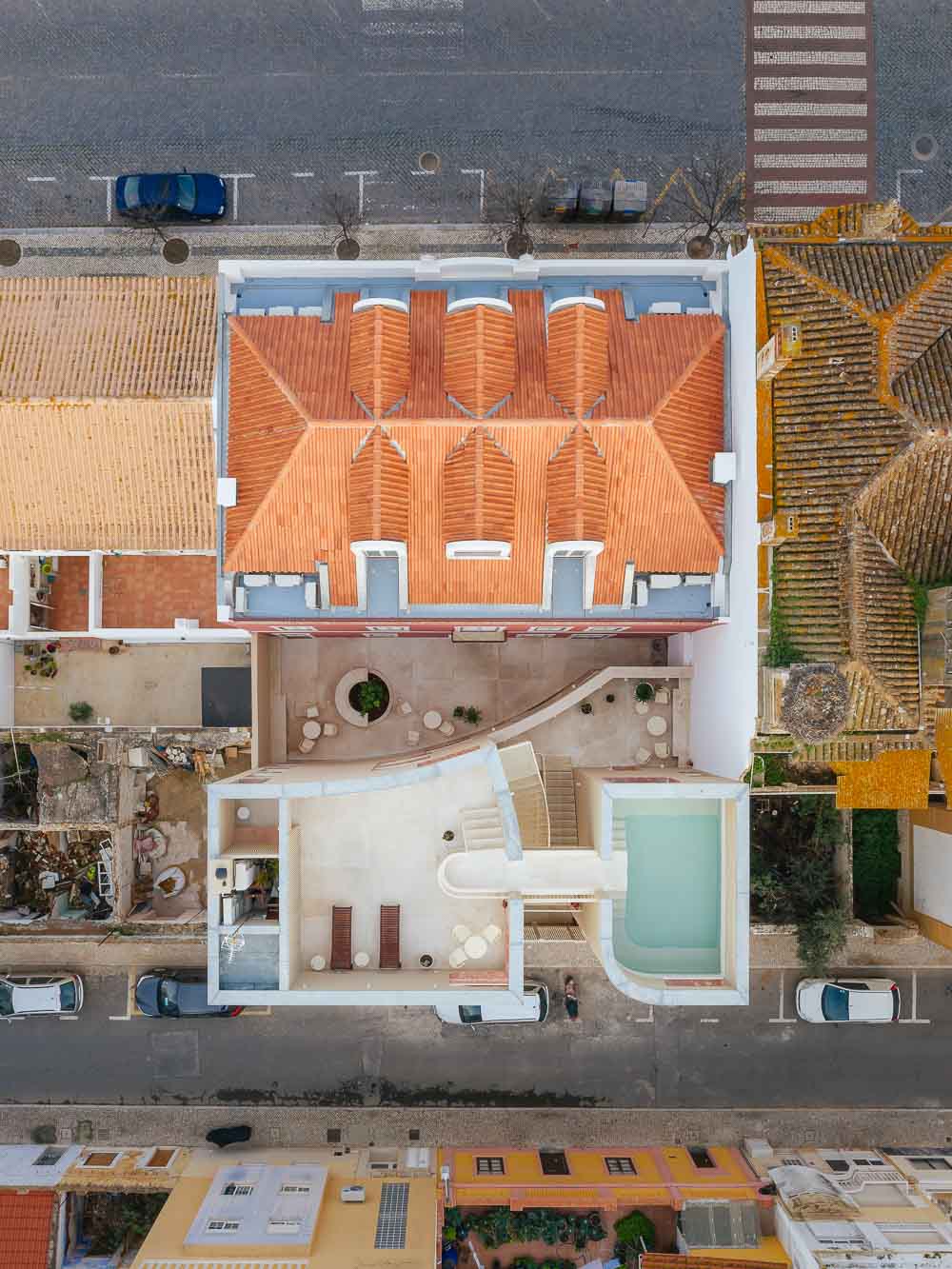 Then, they read the city code where the two buildings would be a harmony. The rules allow us to construct a new addition to the existent building on the back of the plot facing Princesa Street. Being Vila Real de Santo Antonio city center heritage protected, we had strict rules to follow: (1) all new buildings are obliged to have exactly 12m height; (2) to have a clear distinction between old buildings and new additions, the design facade should not be similar to Pombalino style - rectangular french windows organized in an orthogonal grid.