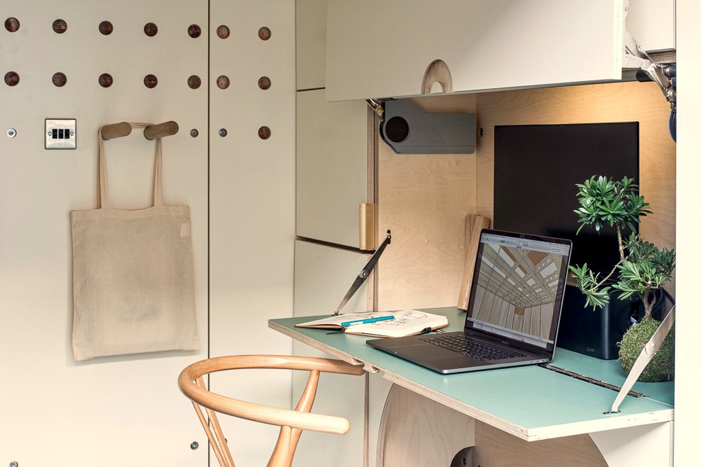 ‘Dot house’ features a bespoke wall with an integrated foldable desk with phone charging unit, hidden computer station, printer and storage. The furniture is provided with lights with motion sensors. Above the wall, a projector screen automatically unrolls to create the perfect environment for a cinema night, an important meeting or video gaming.