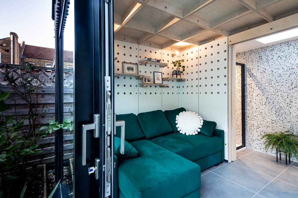 The internal finishes feature exposed birch FSC plywood on the ceiling, concrete tiles on the floor, laminated plywood panels on the walls and terrazzo tiles on the bathroom walls. The interior palette aimed to find a balance between the practical surfaces of the walls, the natural tone of the birch plywood and the intriguing texture of the terrazzo tiles. The room has underfloor heating controlled by a thermostat sensor.