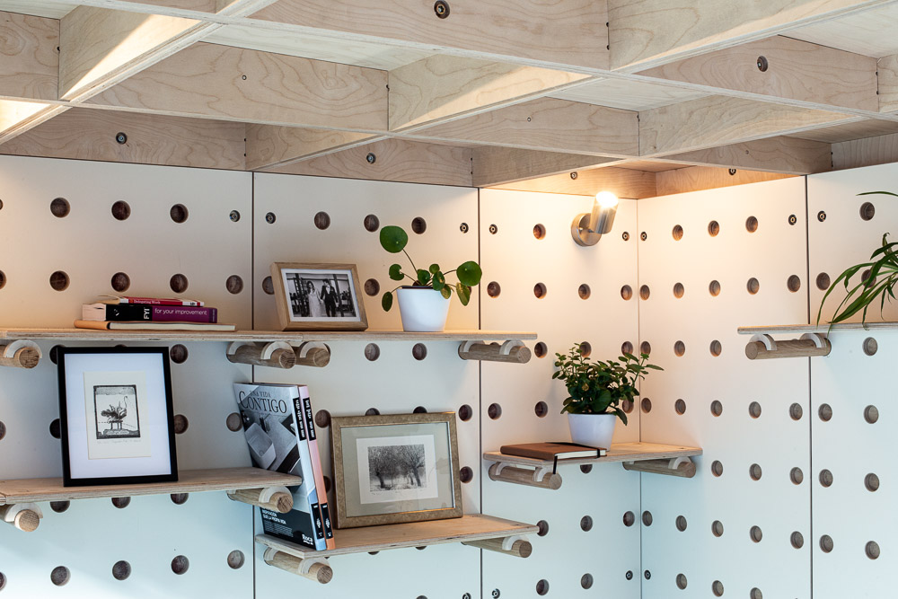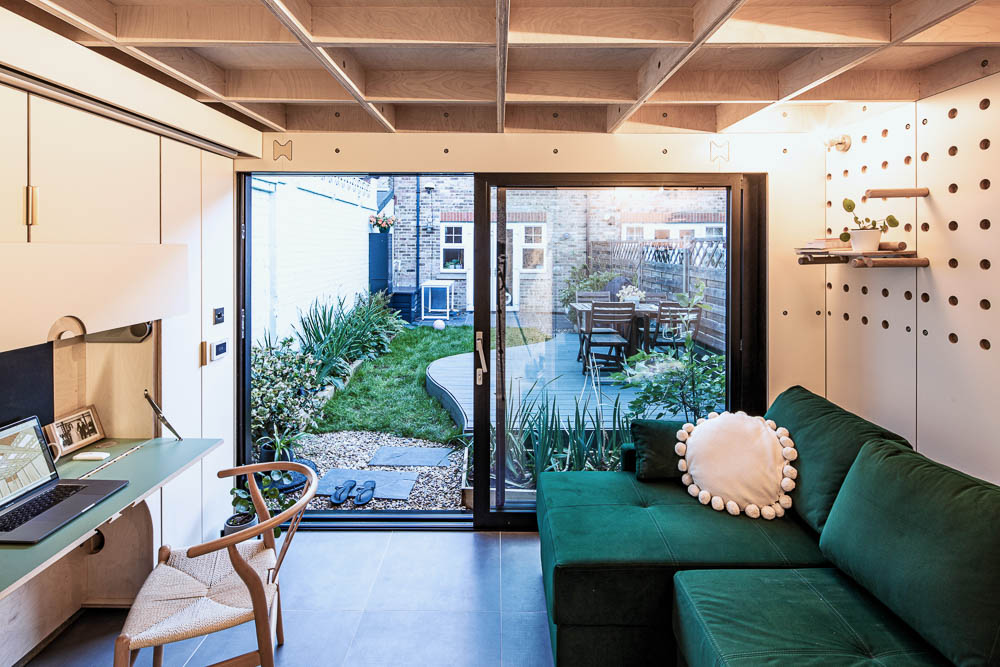 ‘Dot House’ has been entirely pre-manufactured in London in Boano Prismontas’ workshop. The structure is modular and built with a bespoke plywood chassis which incorporates pre-cut holes for passing the electric cabling and all ducts. This allowed the building process on site to be quick, with the main structure erected in just one day on site. Above the sliding door sits a long, yet lightweight, plywood beam designed with misaligned joints to provide the necessary strength. All plywood structural modules are filled with rigid insulation.