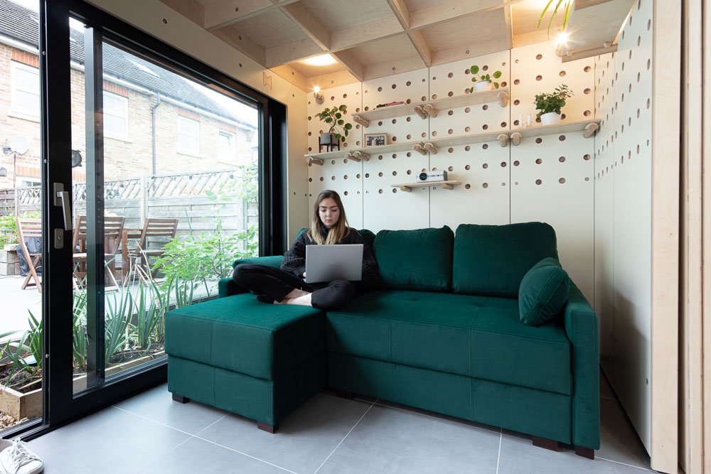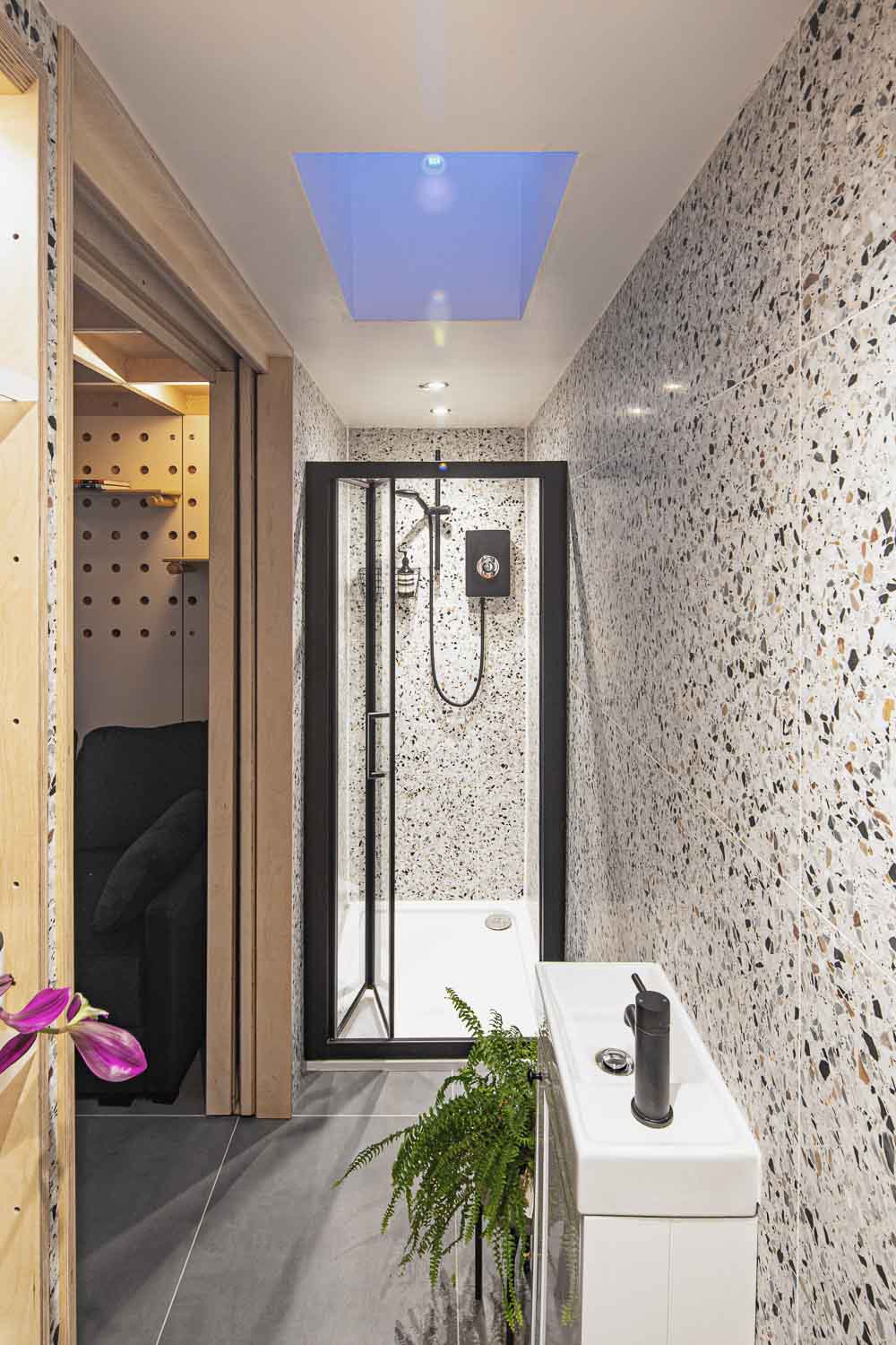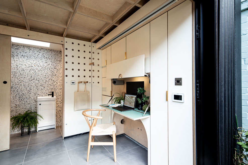 The internal finishes feature exposed birch FSC plywood on the ceiling, concrete tiles on the floor, laminated plywood panels on the walls and terrazzo tiles on the bathroom walls. The interior palette aimed to find a balance between the practical surfaces of the walls, the natural tone of the birch plywood and the intriguing texture of the terrazzo tiles. The room has underfloor heating controlled by a thermostat sensor.