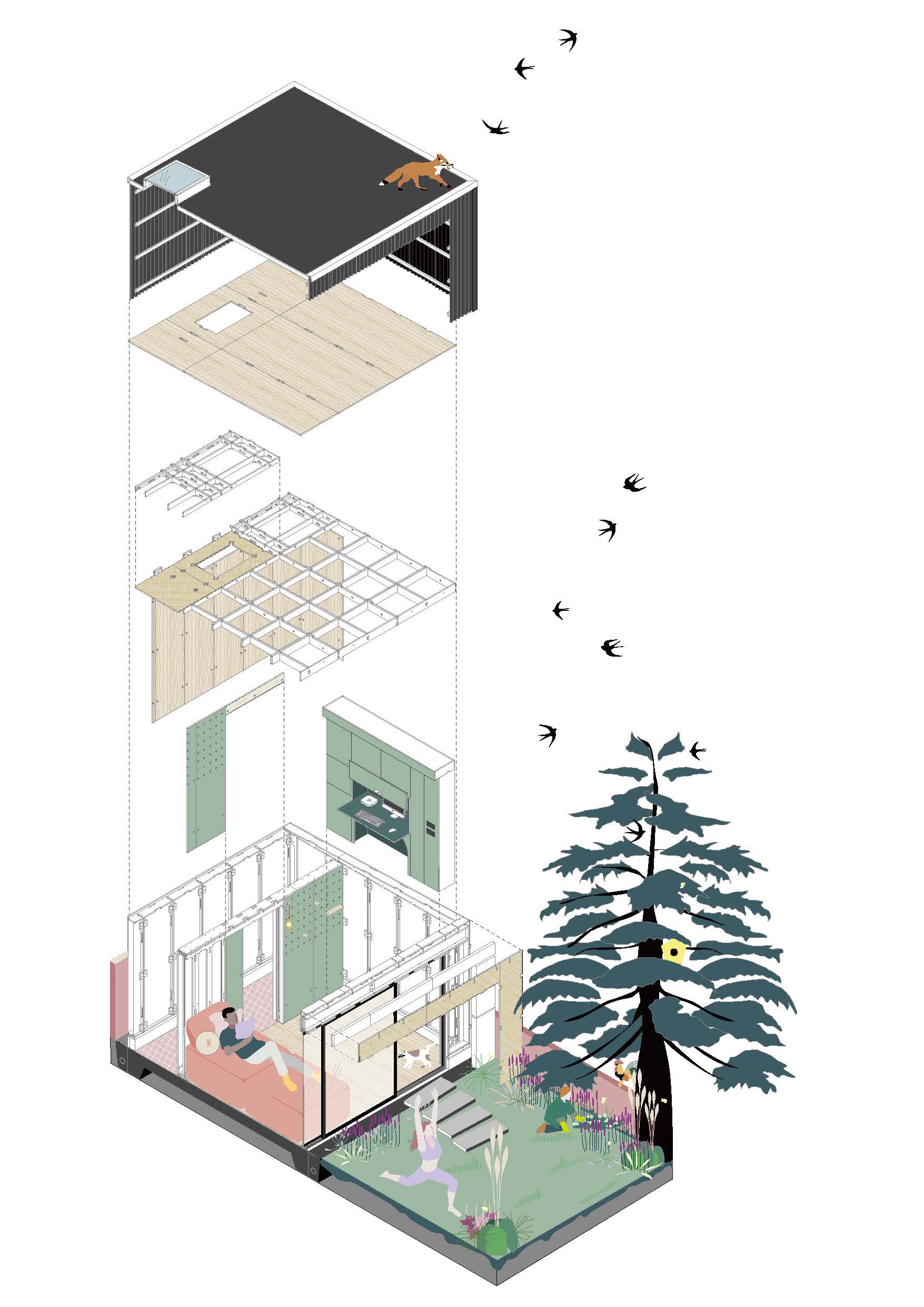 이 집은 런던의 보아노 프리몬타스의 작업장에서 모두 사전 제작됐다. 모듈식 구조에 케이블과 모든 관이 지나가도록 하기 위해 미리 구멍을 낸 맞춤형 합판과 섀시로 제작했다. 이런 작업이 있었기 때문에 현장에서는 단 하루만에 구조물을 세울 수 있었다. 미닫이 문 위에는 적당한 강도를 맞추기 위해 연결부를 엇갈려 디자인한 가벼운 합판 빔이 있다. 모든 합판 구조의 모듈은 단단한 단열재로 채워져 있다.