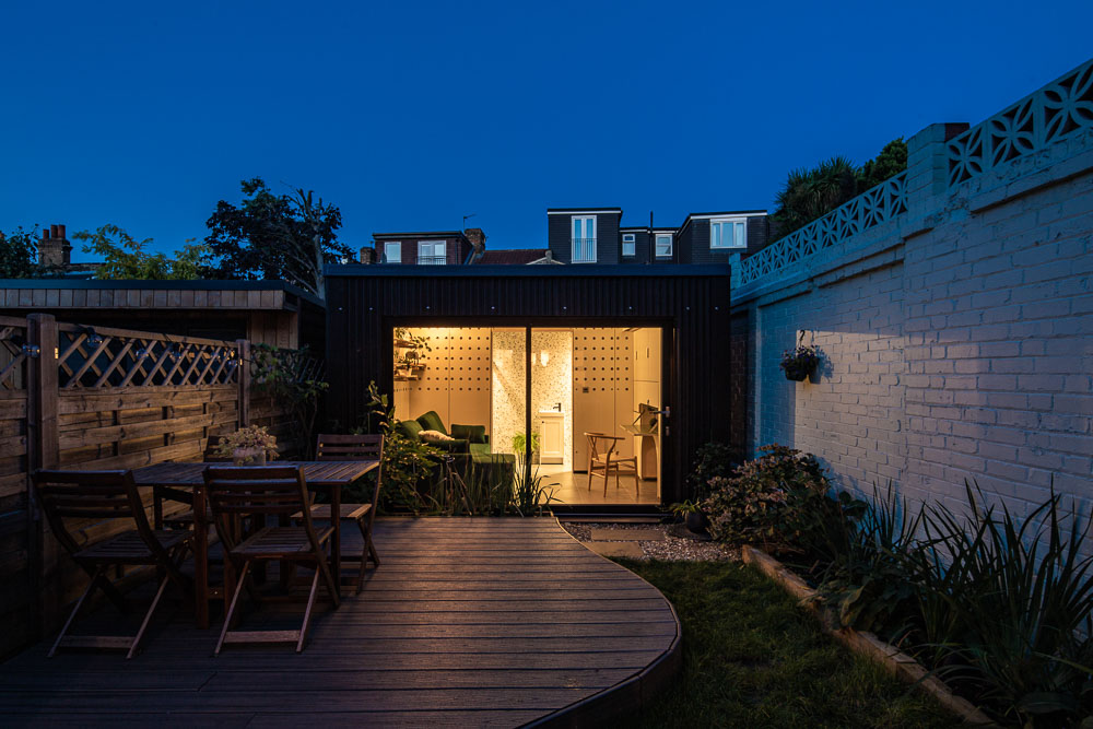 ‘Dot House’ is composed of 2 main spaces, the room and the bathroom. The room is linked to the garden with a 3m wide patio door which establishes a visual connection with the main house, whilst merging the internal spaces with the surrounding garden. The bathroom is hidden behind a bespoke plywood sliding door which opens onto a micro lobby with a skylight. When the door is open, the skylight gives natural light to the room and enlarges the perception of the internal space. The toilet and the shower that fit both ends of the bathroom are always shielded to the view from the room.