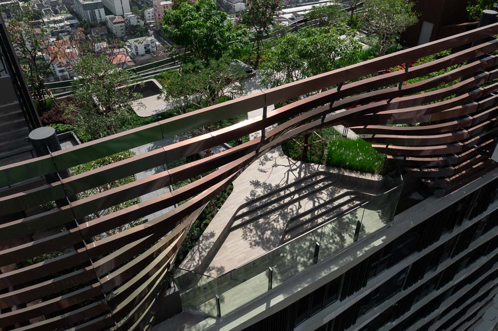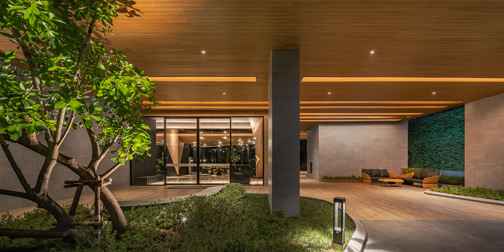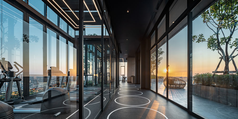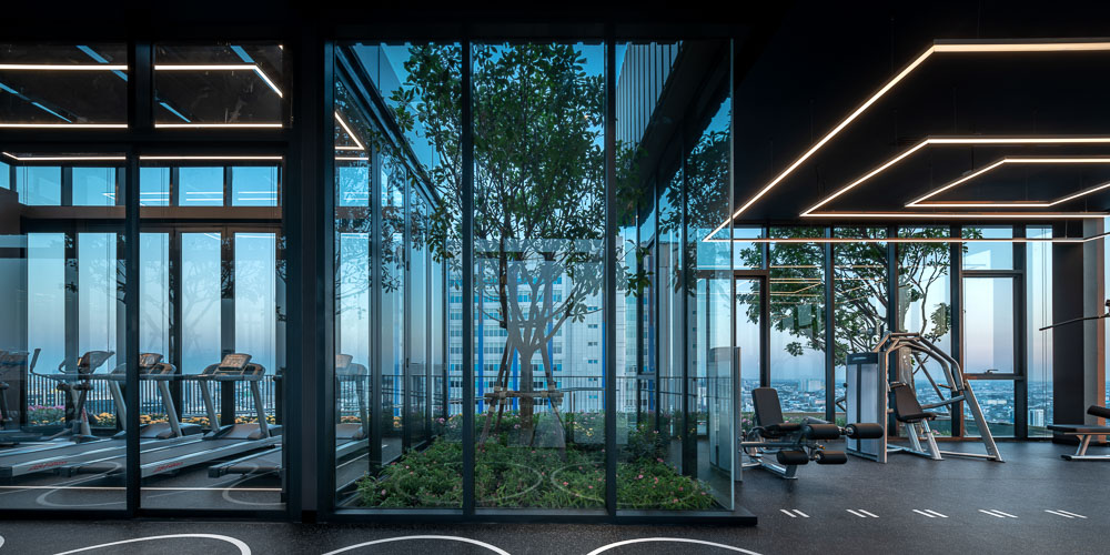 The project is earmarked by the developer to be their first green condominium so besides providing water saving sanitary wares, EV charger, solar cell rooftop, and so on, natural ventilation is encouraged wherever possible to emphasize the idea of living with nature. Large sliding doors at lobby can be fully opened on nice weather days. Residents can open folding doors at rooftop fitness if they wish to use treadmill without air conditioner. Horizontal fins on the façade not only portrays the building image but also provides shading for the rooms.