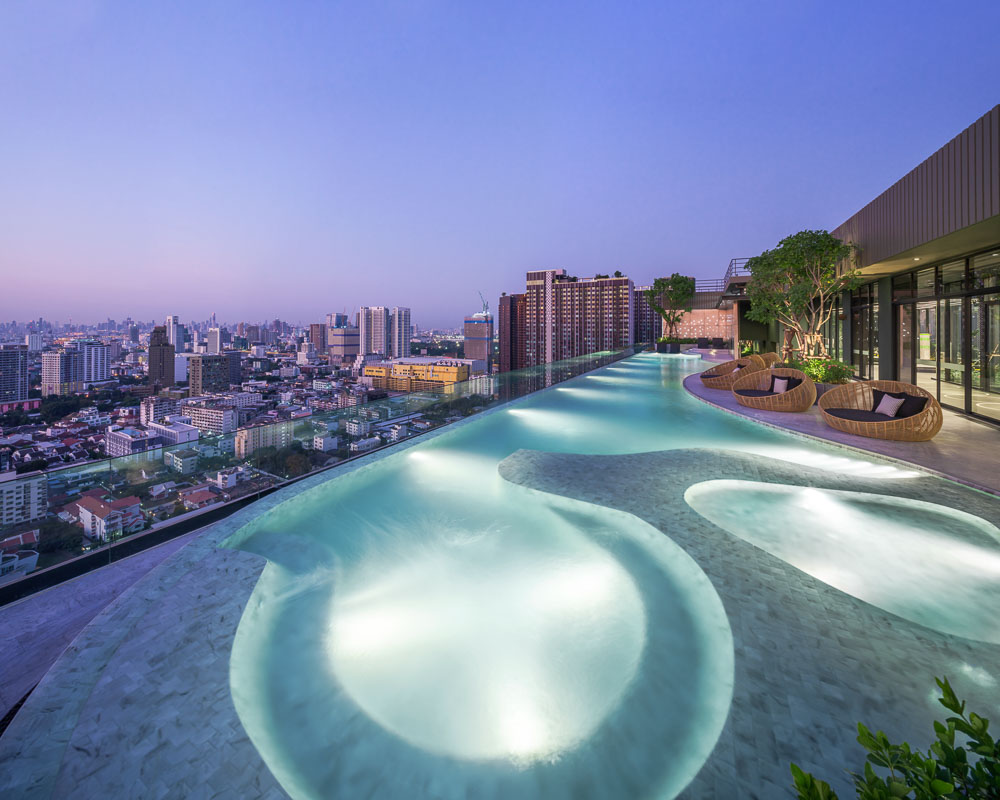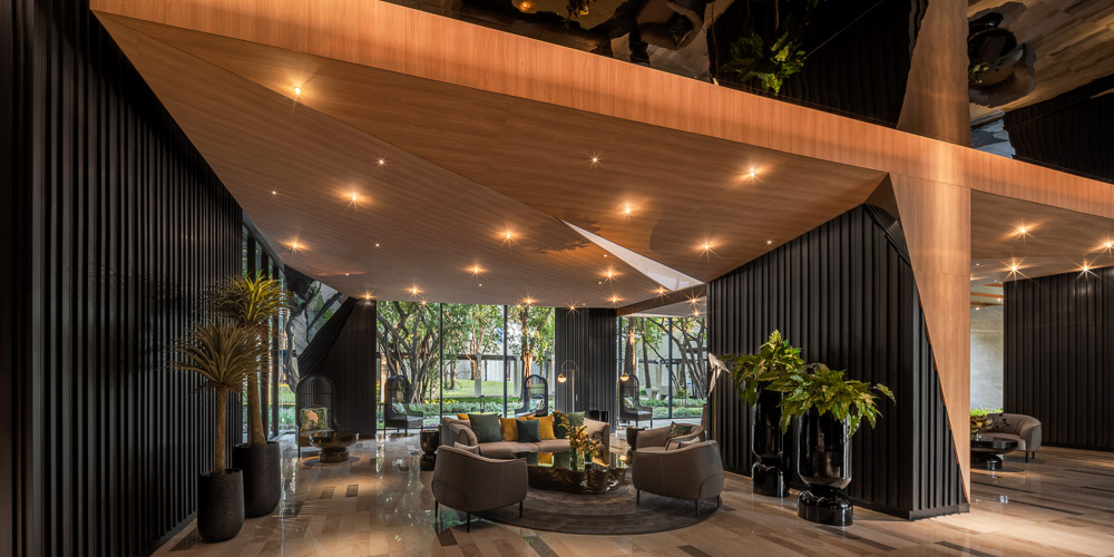 Contextually, the main selling point of the development is a large, park-scaled green area with fully grown trees and its location adjacent to a popular fairytale amusement park. With this ‘double park’ condition, the design team imagined a magical tree growing out of the vast green area as a design concept which is thoroughly used as a common theme for architectural, landscape and interior designs; root/cave for ground floor, tree hole for facilities at 22nd floor and tree canopy for the rooftop. A giant mythical tree with bird nests and tree friends conforms with the tagline, imagination is everything, set by the marketing team.
