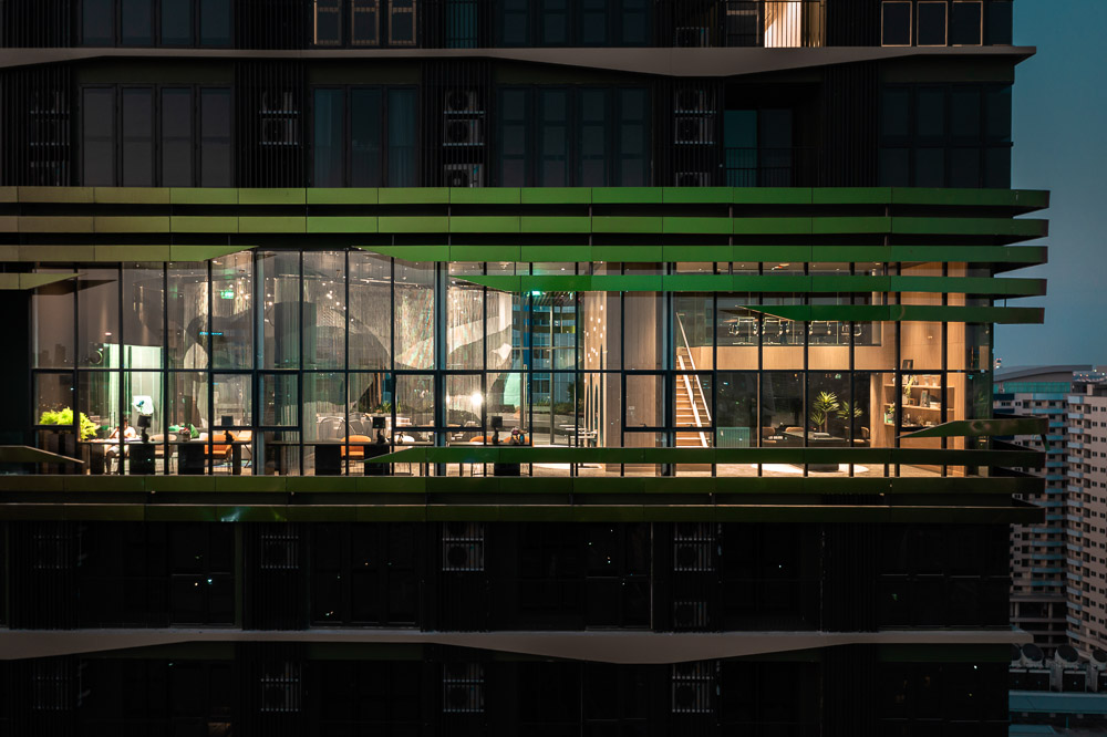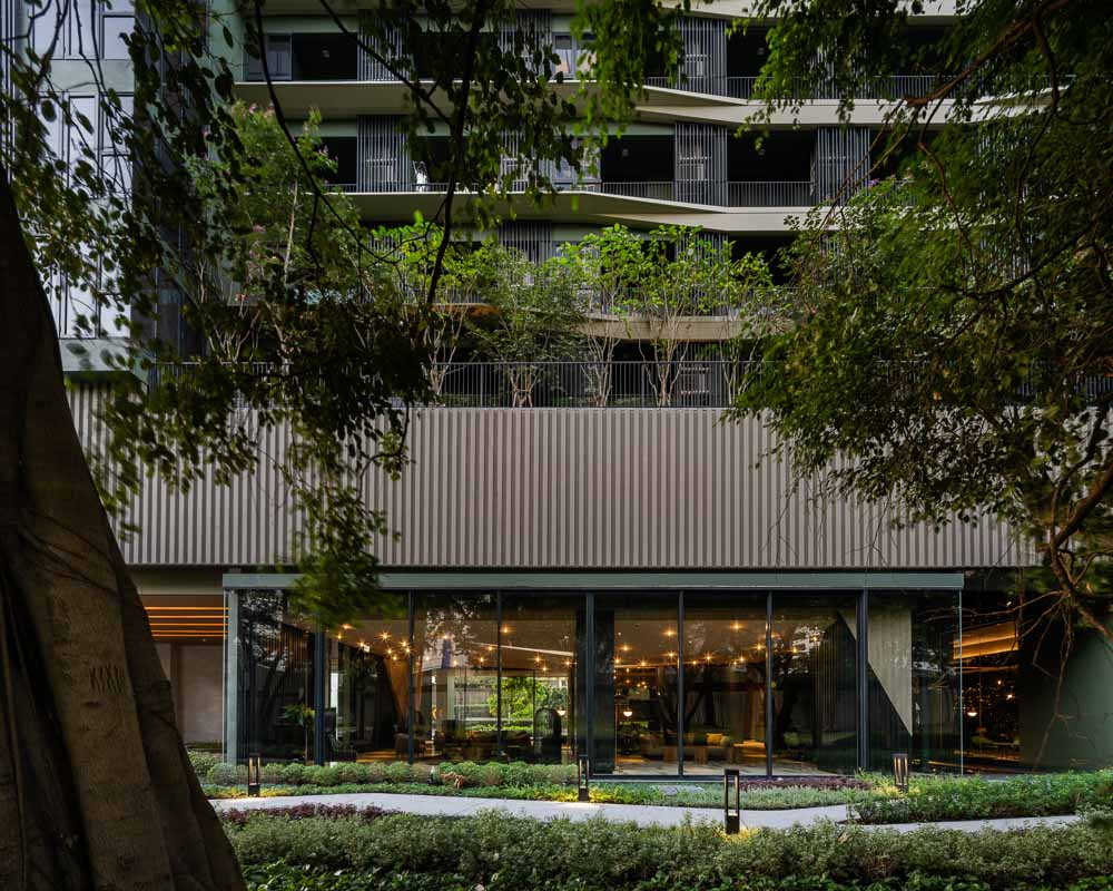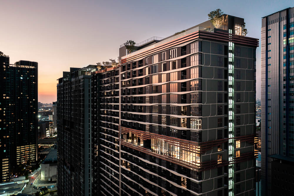 The façade design composes of rows of precast concrete fins twisted and tapered at specific points to create an image of tree silhouette. Due to the complexity of the pattern, there are more than hundred variations of module. The precast panels at gable end walls have recessed pattern mimicking tree bark texture. Communal facilities at 22nd floor and roof terrace are wrapped with warped strips of spectra aluminium composite panel that change colours when seen from different angles. The iridescent strips combine into double curvature surface to represent bird nest on the tree. Such surface is peeled apart for light and view to the rooms and pulled back at the roof level to create a viewpoint for an observation deck.