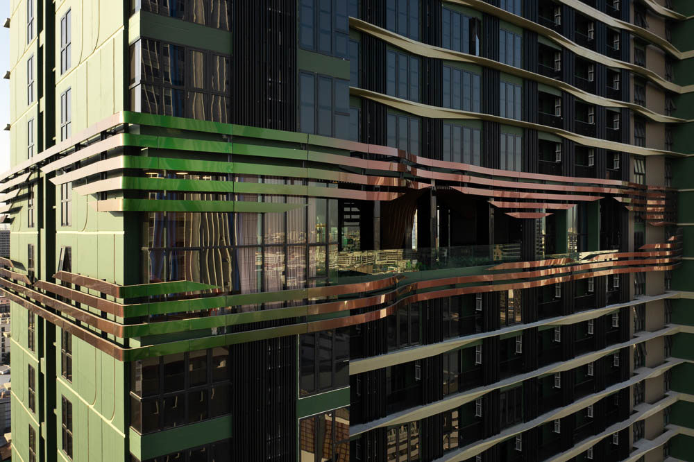 파사드 디자인은 나무 실루엣의 모습을 만들기 위해 꼬이고, 늘어지는 프리캐스트 콘크리트 핀을 줄지어 두었다. 복잡한 패턴으로 수백 가지 이상의 변형 모듈을 만들었다. 박공 끝 벽 프리캐스트 패널은 나무껍질의 질감을 내기 위한 오목한 패턴이 있다. 22층의 공용 시설과 옥상의 테라스는 각도에 따라 색이 변하는 휘어진 형태의 스팩트럼 알루미늄 복합 패널로 둘러싸여 있다. 나무 위 새 둥지를 나타내기 위한 무지개 빛깔의 스트립은 이중 곡률 표면을 만들어 낸다. 이러한 표면은 빛과 방의 뷰를 위해 벗겨지고, 전망대의 뷰를 만들어내기 위해 지붕 높이에서 뒤로 당겨져 있다.