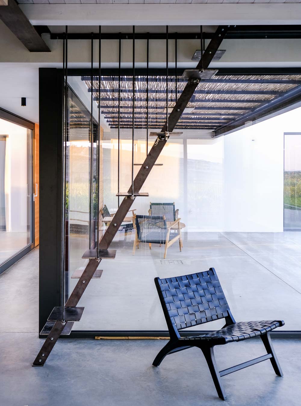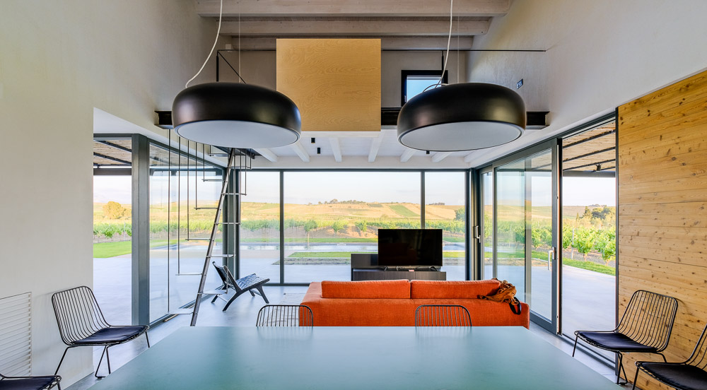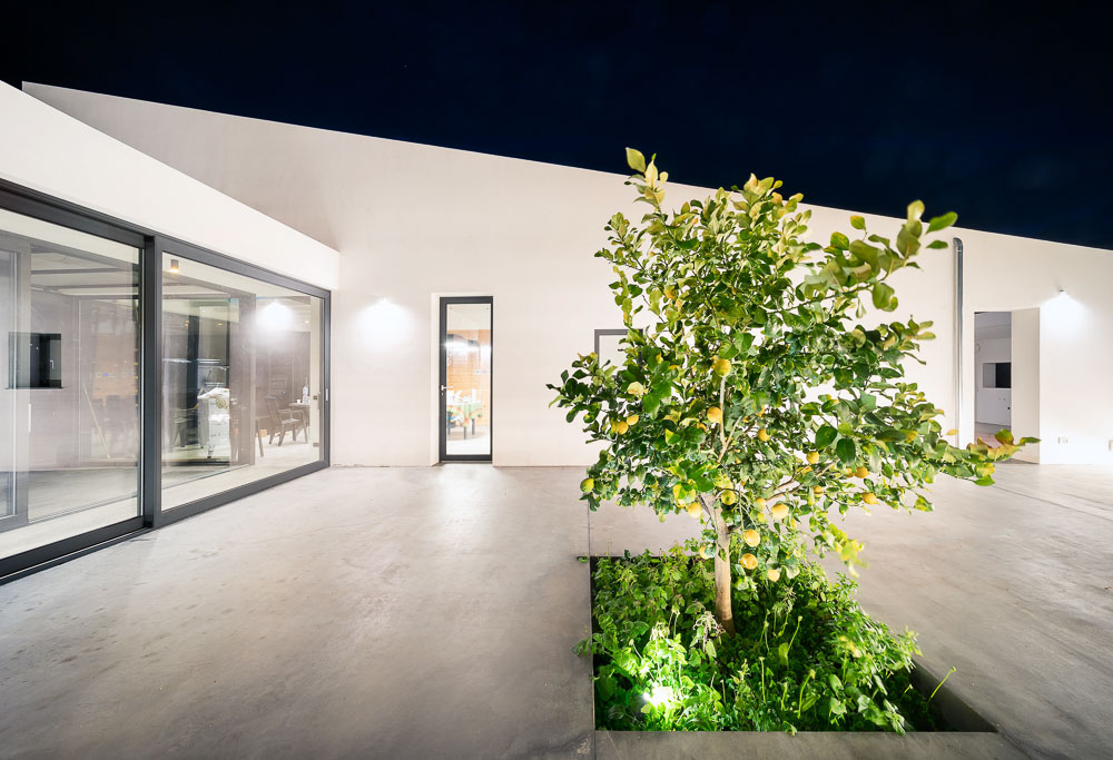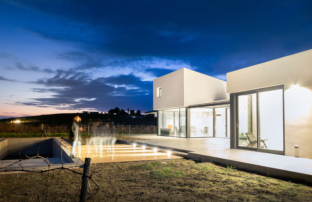 The building consists of two parallelepiped-shaped volumes with a single floor connected by a glazed corridor. The complex is characterized by openings that allow it to be crossed both visually and spatially. The external spaces are in direct relationship with the vineyard. The larger volume is characterized by a roof with a slope of 17% here it is possible to find the living-kitchen area. This volume is connected to the sleeping area through a glazed passage that filters between an internal courtyard and the countryside. The bedrooms are inside the second volume with a flat roof. The rooms are connected with an hallway which is accessible from the external veranda. All the outdoor spaces are designed to be lived in, the shading systems protect the large windows and create areas where you can gather and stay with your own guests. Through a few steps you reach the solarium and the swimming pool which enjoys a magnificent view of the surrounding countryside. The patio between the two volumes is characterized by the presence of a lemon and a system of benches covered in blue majolica that express contemporary Sicilian Living.