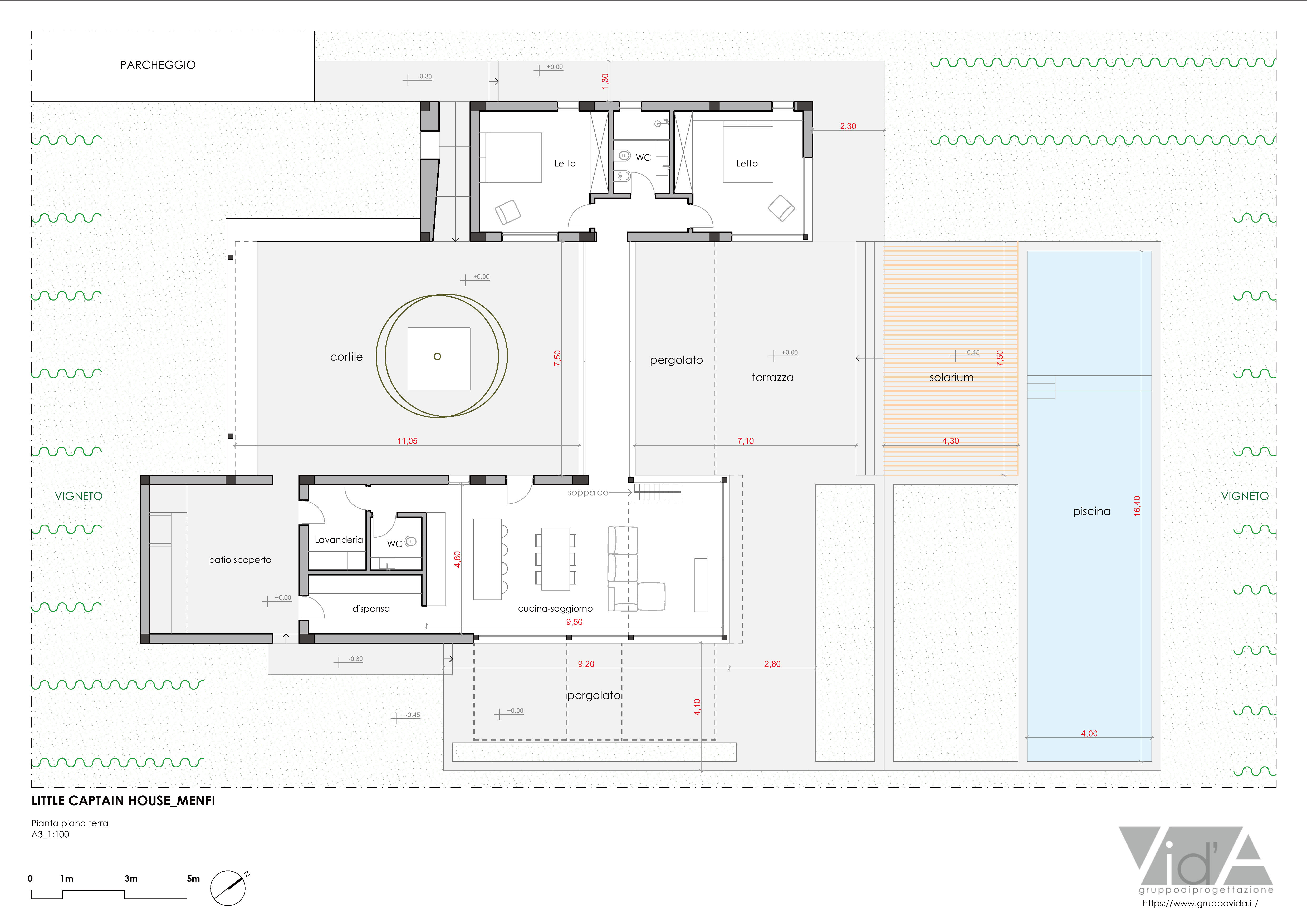 건물은 두 개의 평행한 형태의 장서로 이루어져 있으며, 한 층은 유약을 바른 복도로 연결되어 있다. 이 단지는 시각적으로나 공간적으로나 교차할 수 있는 개구부가 특징이다. 외부 공간은 포도밭과 직접적인 관계에 있다. 부피가 큰 지붕은 17%의 경사를 가진 것이 특징이며, 이곳에서는 생활주방 공간을 찾을 수 있다. 이 책은 안마당과 시골 사이를 거르는 유리로 된 통로를 통해 잠자는 곳과 연결되어 있다. 침실은 지붕이 평평한 2층에 있으며, 객실은 외부 베란다에서 접근할 수 있는 복도와 연결된다. 모든 실외 공간은 거주할 수 있으며, 차광 시스템은 큰 창문을 보호하고 거주자와 손님들이 함께 모이고 머물 수 있는 공간이다. 몇 걸음만 걸으면 솔라륨과 주변 시골의 절경을 감상할 수 있는 수영장이 보인다. 두 볼륨 사이의 파티오는 현대 시칠리아 생활을 표현한 푸른 마졸리카로 덮인 레몬과 벤치가 마련되어 있다.