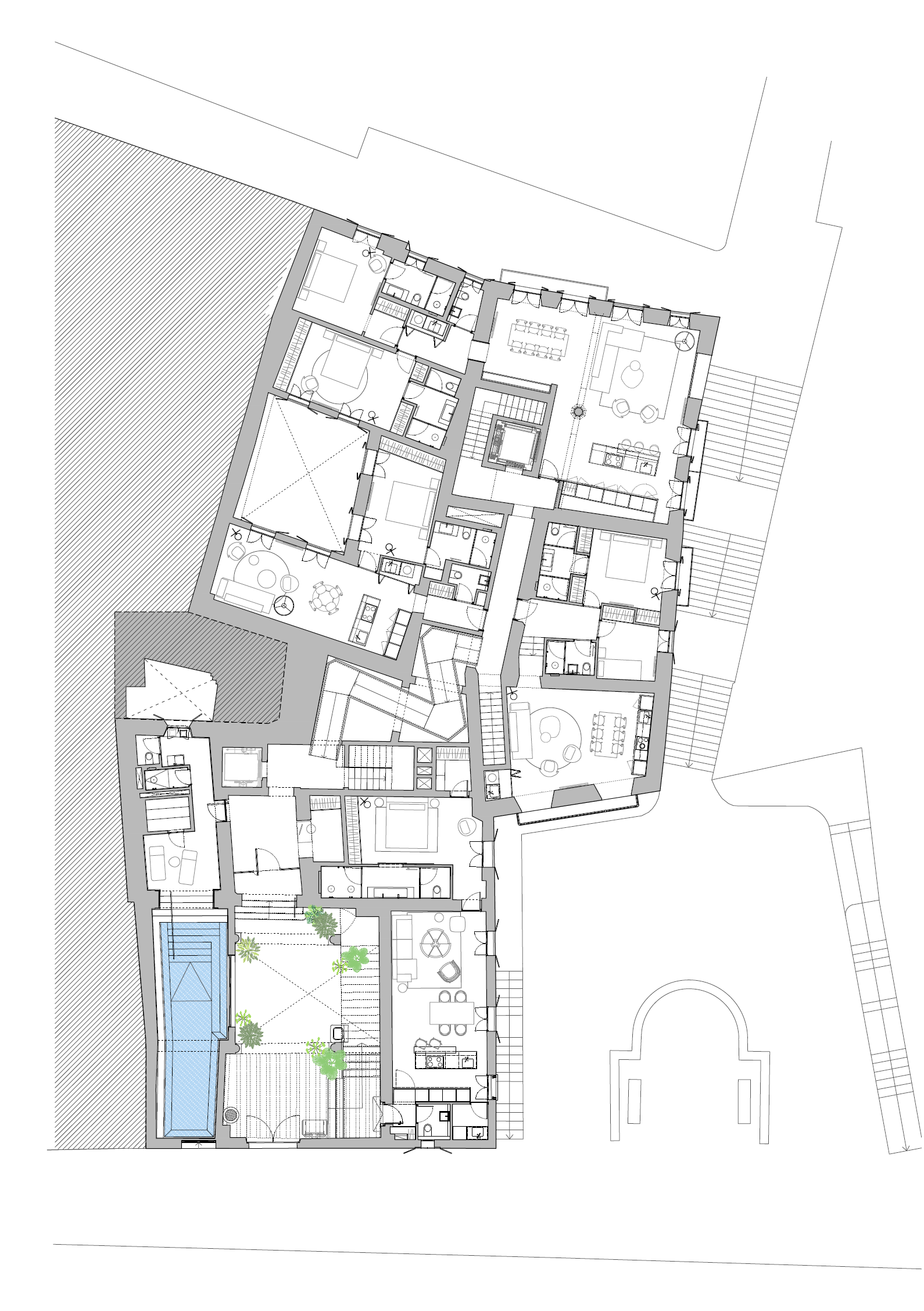 The project recovers the entrance courtyard that had been altered in the reforms of the last century, restoring the old splendor of this space. The courtyard becomes the main entrance to the heart of the building, communicating with the landscaped terraces upwards and with the communal areas such as a gym and an indoor swimming pool with a spa that directly overlooks the courtyard. A second inner courtyard has been also recovered as a garden for one of the dwellings and five terraces for different dwellings.