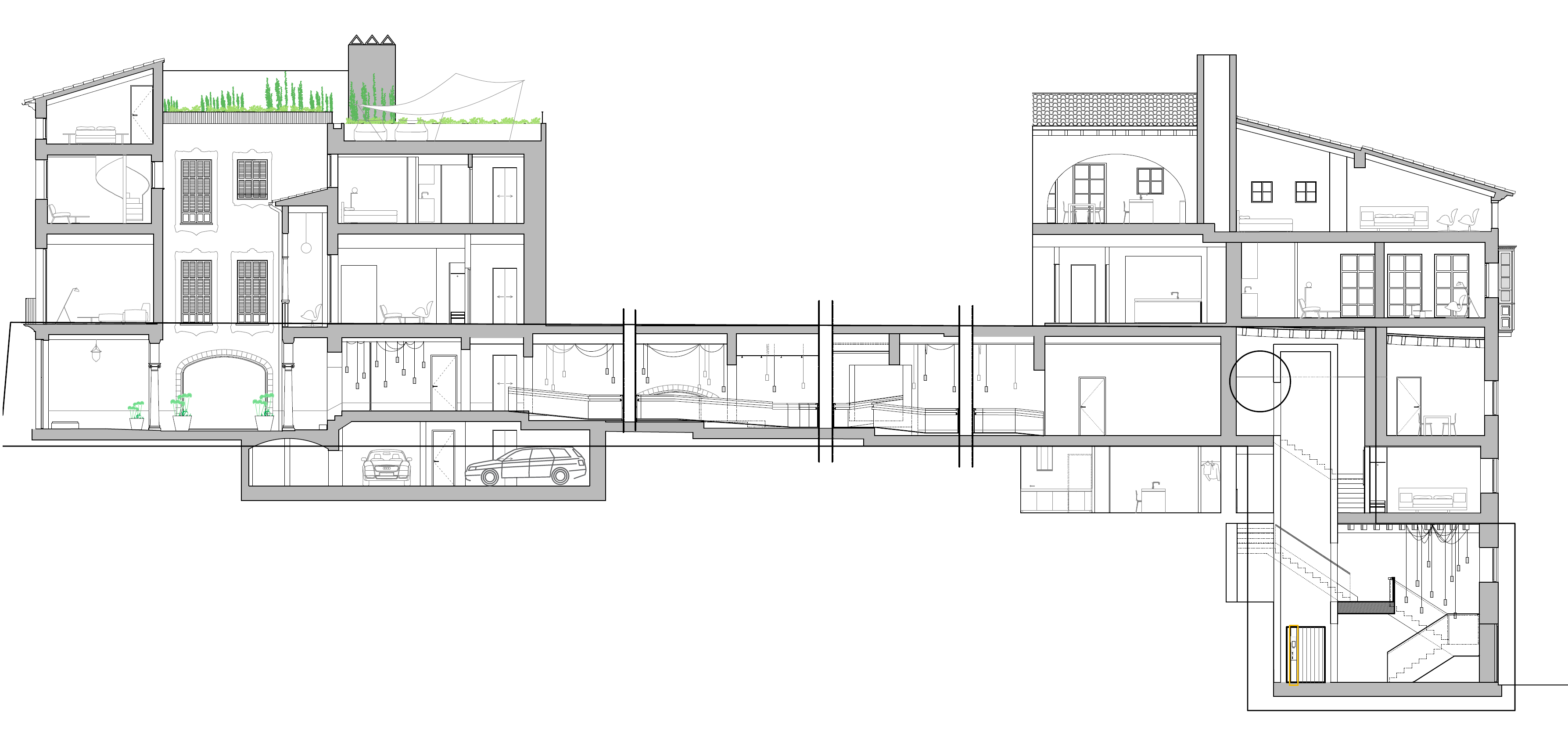 The project recovers the entrance courtyard that had been altered in the reforms of the last century, restoring the old splendor of this space. The courtyard becomes the main entrance to the heart of the building, communicating with the landscaped terraces upwards and with the communal areas such as a gym and an indoor swimming pool with a spa that directly overlooks the courtyard. A second inner courtyard has been also recovered as a garden for one of the dwellings and five terraces for different dwellings.