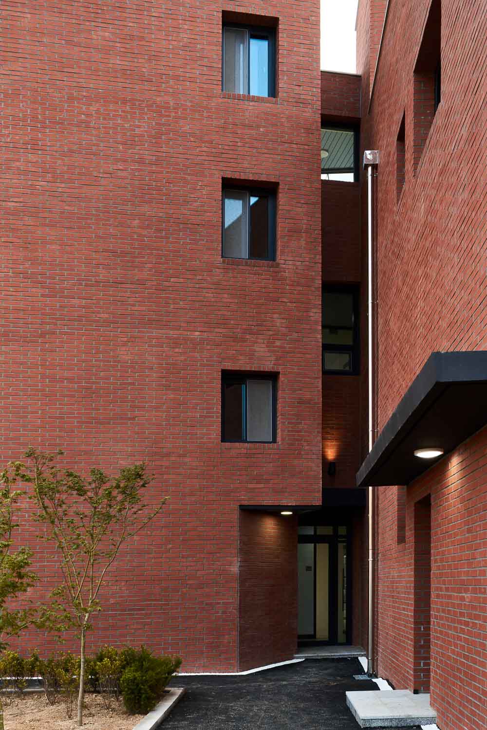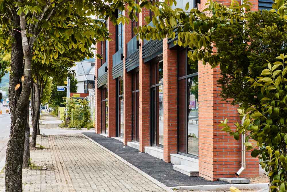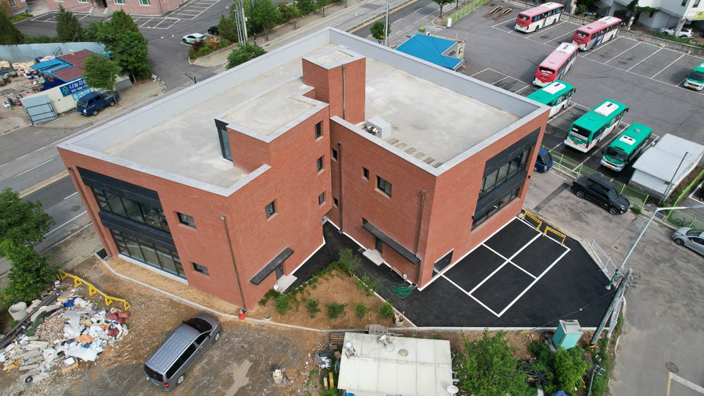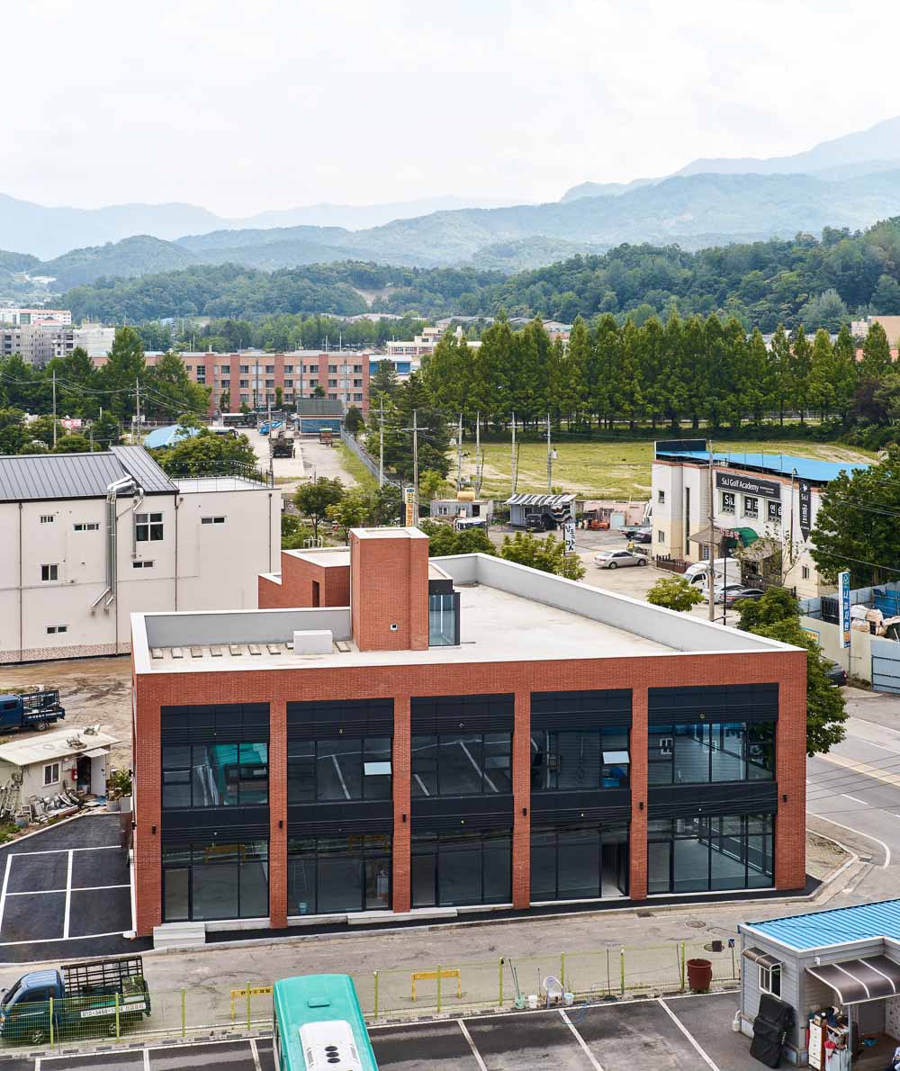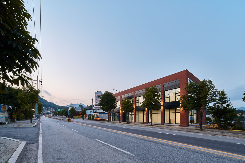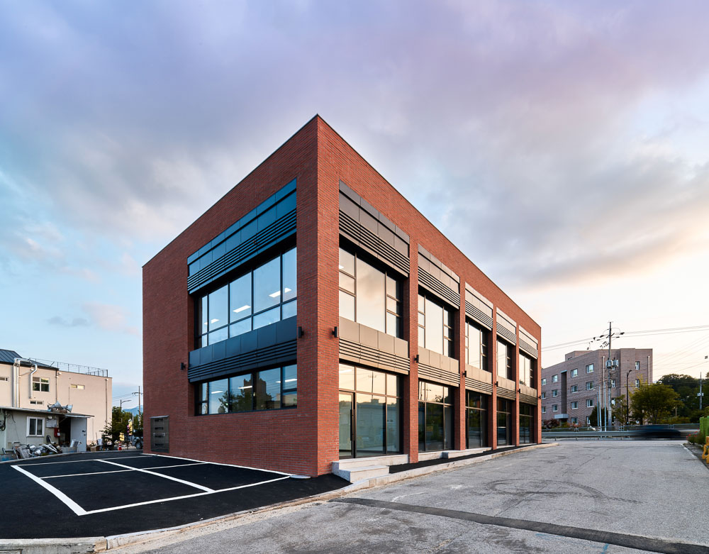 National Road 37 going from Cheongpyeong to Pocheon was a typical, chaotic street until M State1292 was laid out. Most of the area surrounding this triangular site in Hyeon-ri, Jojong-myeon was a mixture of old and underdeveloped areas. The soft, warm feeling of red brick and the cold, clean feeling of glass blend together. Although it is a commercial building for lease, it is unique in that each facade of the building changes with the variation in materials or placing of the columns. In particular, a garden is created in the rear of the building where the secondary entrance is located to provide a small resting place with green trees, and minimal windows are planned, creating a completely different space from the front area.