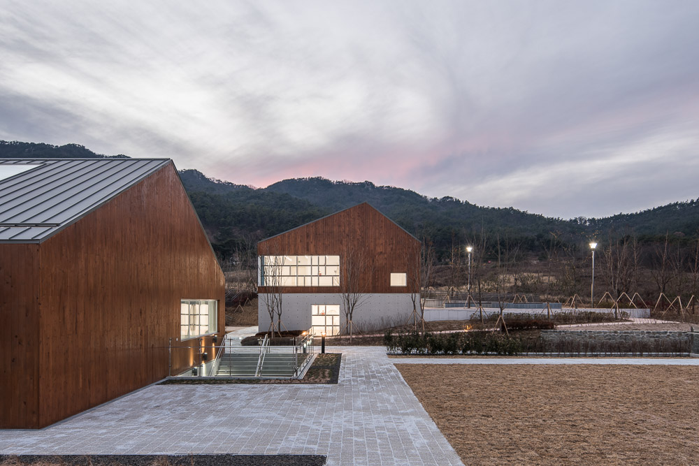 The support / play area is located at the lowest level of the ground as an infrastructure for the operation of the entire facility. The major part of the building is hidden underground, but the main facade faces the front road and the ecological pond. The 80-meter-long facade reveals a unique hilly landscape using thick concrete representing the site and transparent/reflective glass. The play area has indoor play area, exhibition space, an outdoor ecological observation deck, and creative exhibition space. This space is operated separately and opens on weekends as well. The wind meadow built on the artificial ground was planned as a relatively static resting area. For the most of the time, it is a place where parents can enjoy a view of the city below the mountain in connection with the parents’ cafe. Outdoor theater can be used for outdoor activities such as outdoor concerts in conjunction with children’s puppet theater.