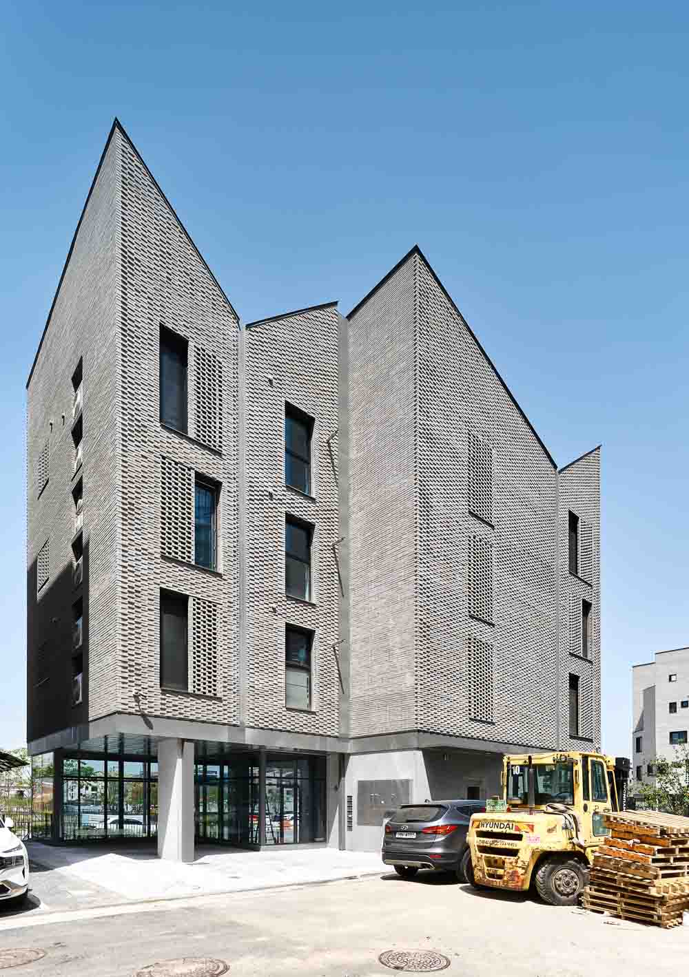 다이내믹한 지붕선을 가진 입면을 따라 평면 또한 들쭉날쭉하게 설계하고자 했지만, 건폐율과 용적률을 최대로 확보해야 하는 임대건물의 한계로 평면은 입면과 다르게 요철 없이 평범하게 계획해야 했다. 이런 평면의 한계를 벽돌 쌓기 방식을 통해 해결하고자 했다.
