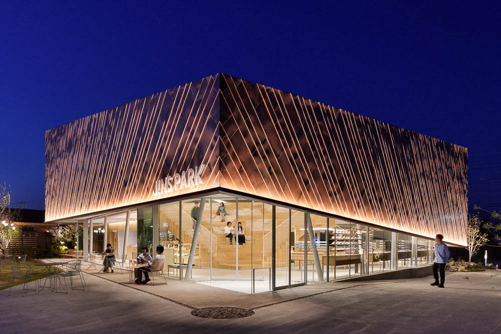 JINS PARK is designed to serve as a community plaza where bread and coffee as well as glasses are sold and neighbors can hold markets and lectures. Both inside and outside, there are relaxed spaces with no set function where a wide range of experiences and events take place, attracting a lively stream of community members. As the landscaping matures and the copper facade blends more fully into its surroundings, we hope the store will become part of everyday life in the neighborhood.