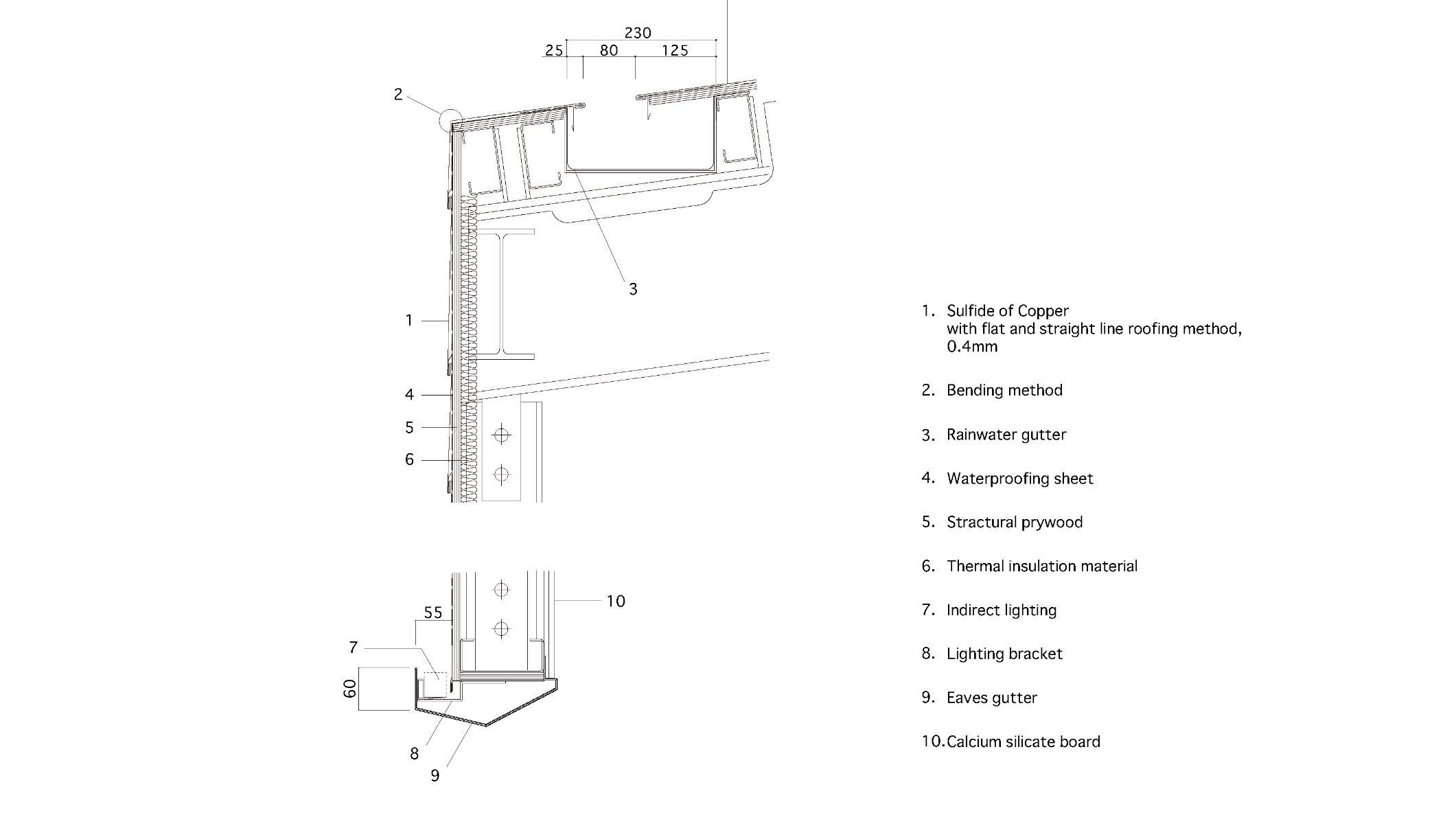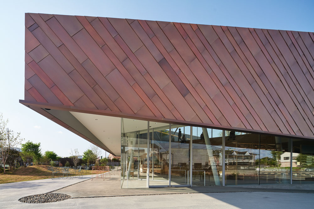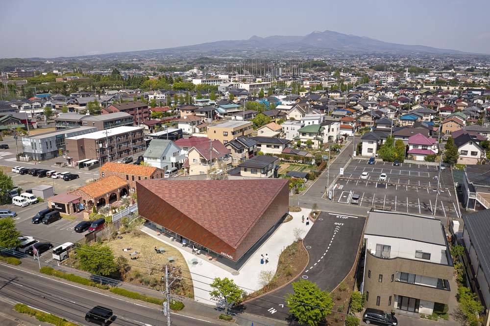 Located about fifteen minutes by car outside central Maebashi, a city in Gunma Prefecture about 100km from Tokyo, the shop sits in a leafy residential neighborhood with a view of iconic Mt. Akagi. The building floats like a trapezoidal box against this backdrop, its sulfurized copper facade echoing the reddish-brown color of the mountain. The exterior walls slope down toward the residential district to maintain privacy for neighbors, while the side facing the tree-lined main street showcases activity inside the store with large plate-glass windows. The facade’s appearance changes as the sun moves across the sky, and at night the edges of its slanted copper strips glitter with reflected light like shooting stars.