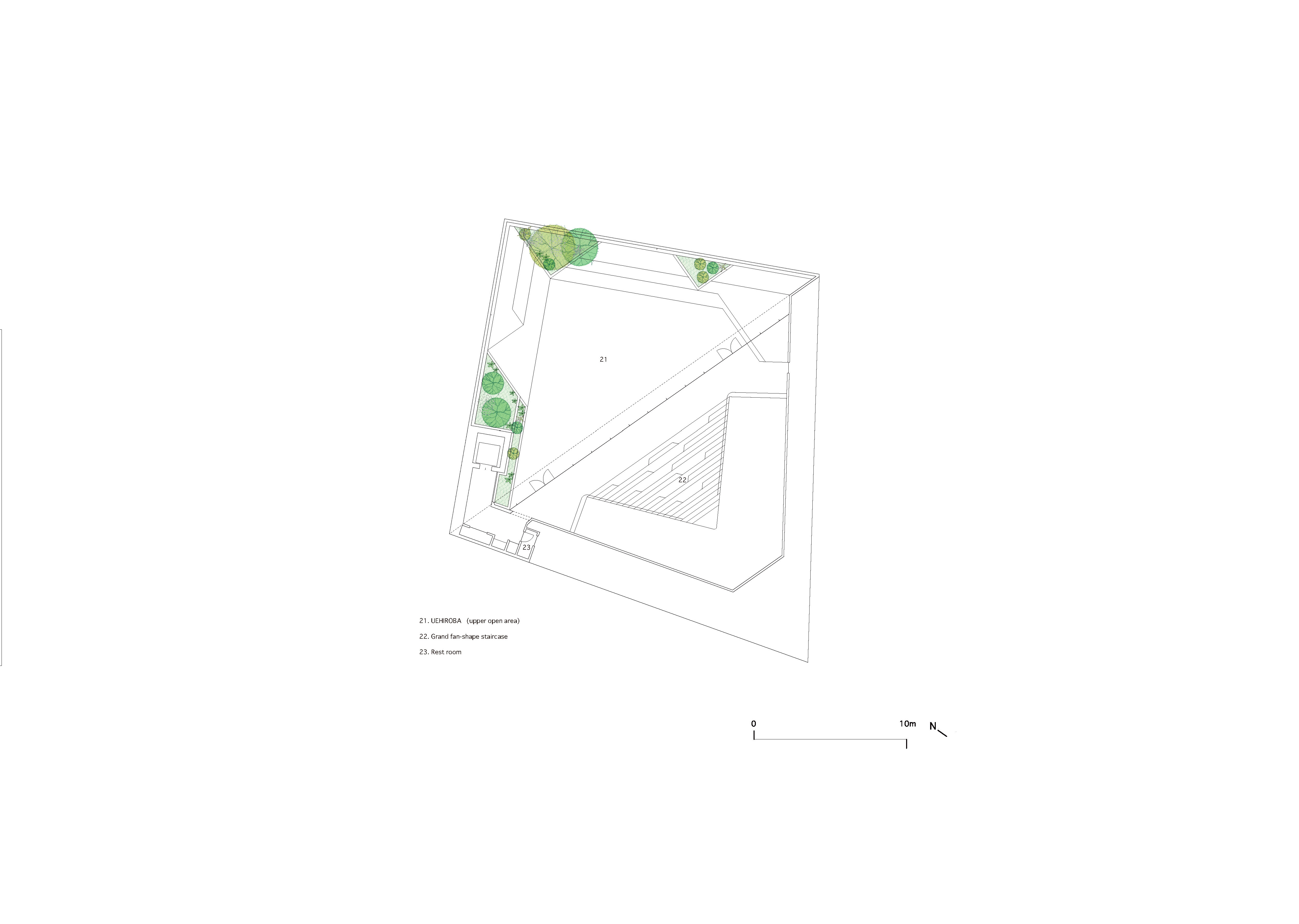 방문객들은 아름다운 정원 통해 건물의 안으로 들어선다. 내부의 부채꼴 형태를 한 계단과 매끄러운 하얀 천장은 푸른 하늘로 시선을 이끈다. 계단에 놓여있는 좌석에서는 가게와 정원, 거리를 내려다볼 수 있다. 계단 꼭대기에는 아이들이 뛰어놀기 충분한 테라스와 앉거나 누울 수 있는 벤치가 있다. 맑은 날에는 1층 정원을 향한 유리문을 열어 내부와 외부를 연결하고, 테라스에서 계단의 아트리움까지 산들바람을 느낄 수 있다.