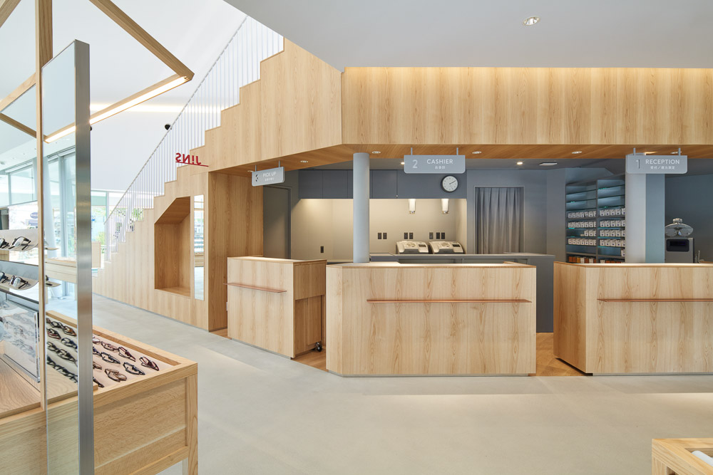 This store for the major eyewear brand JINS is located on a busy suburban thoroughfare. As online shopping becomes more common, physical stores must go beyond serving as places to handle or try on goods; they must also offer in-person experiences. Because this store is located close to a residential neighborhood with many young families, our concept was to create a park-like space where children and parents as well as others in the community can stop by to spend time even if they’re not buying glasses.