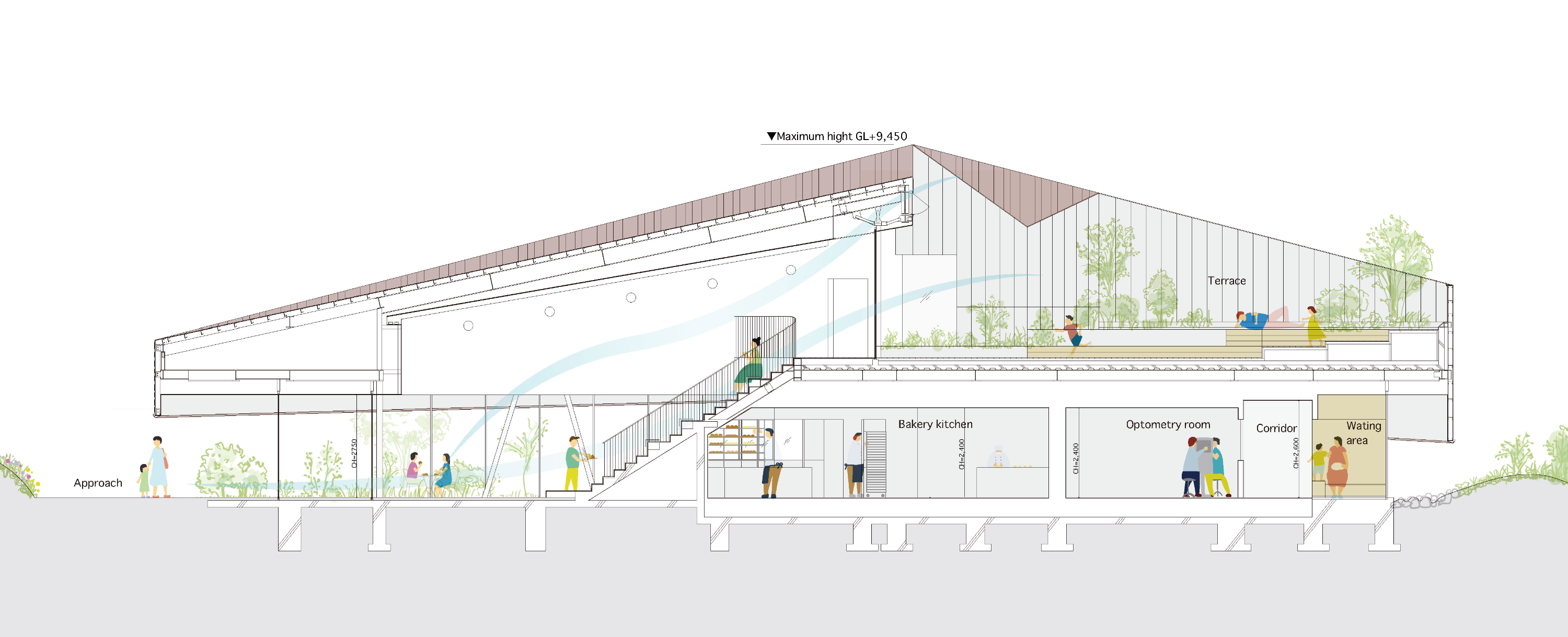 We began by reversing the typical layout of roadside stores, with a parking lot located in front, and instead located the parking lot behind the building. The landscaped approach and front garden lead through the building to a second-floor terrace, creating an interlinked, three-dimensional spatial experience. In stores of this type, the second floor is typically not open to customers. By utilizing it as a terrace and also including a bakery-cafe in the store, we proactively created public spaces that are not part of the sales floor, which encourages community members to come for reasons other than shopping.