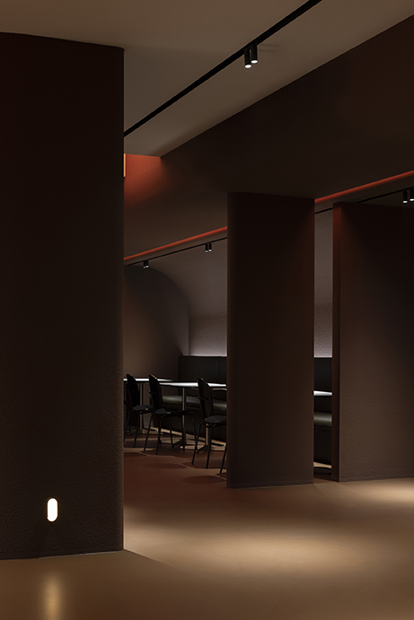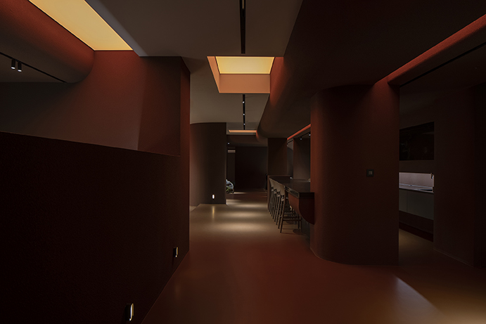 Cavelight, placed throughout the space, was planned to convert the space into a completely different space-time using an RGB lighting integration system with color control. The artificial lighting setting from dawn when the sun rises to sunset evening with the passage of time allowed the time zone to be recognized even without sunlight, and the subtle light gave a calm sensibility to create an immersive environment. This light has the potential to change to a flexible and dynamic atmosphere due to the reflection of the red rough walls, the floor with a slight luminosity, and the smooth ceiling, which can be changed for various events. The preceding factors were reckless but effective ways to completely change the way users spend their time here.
