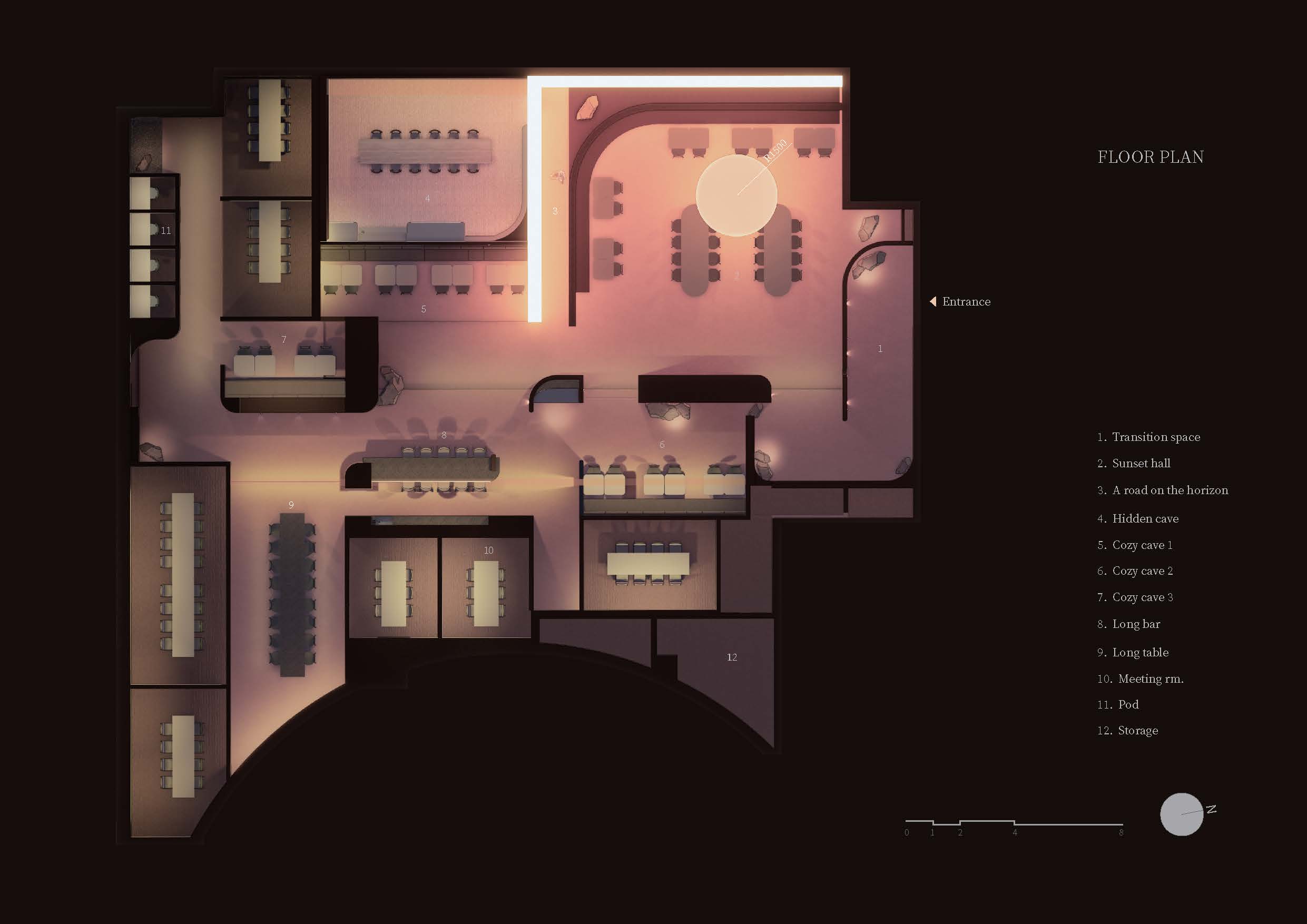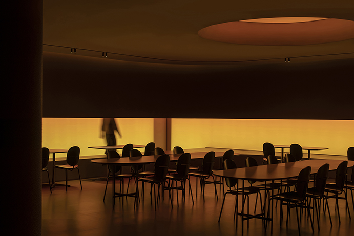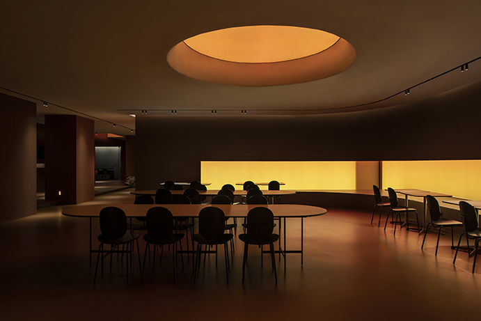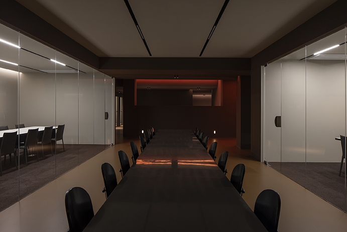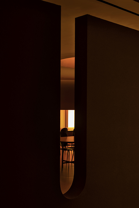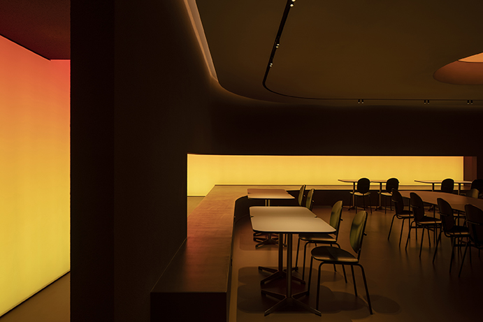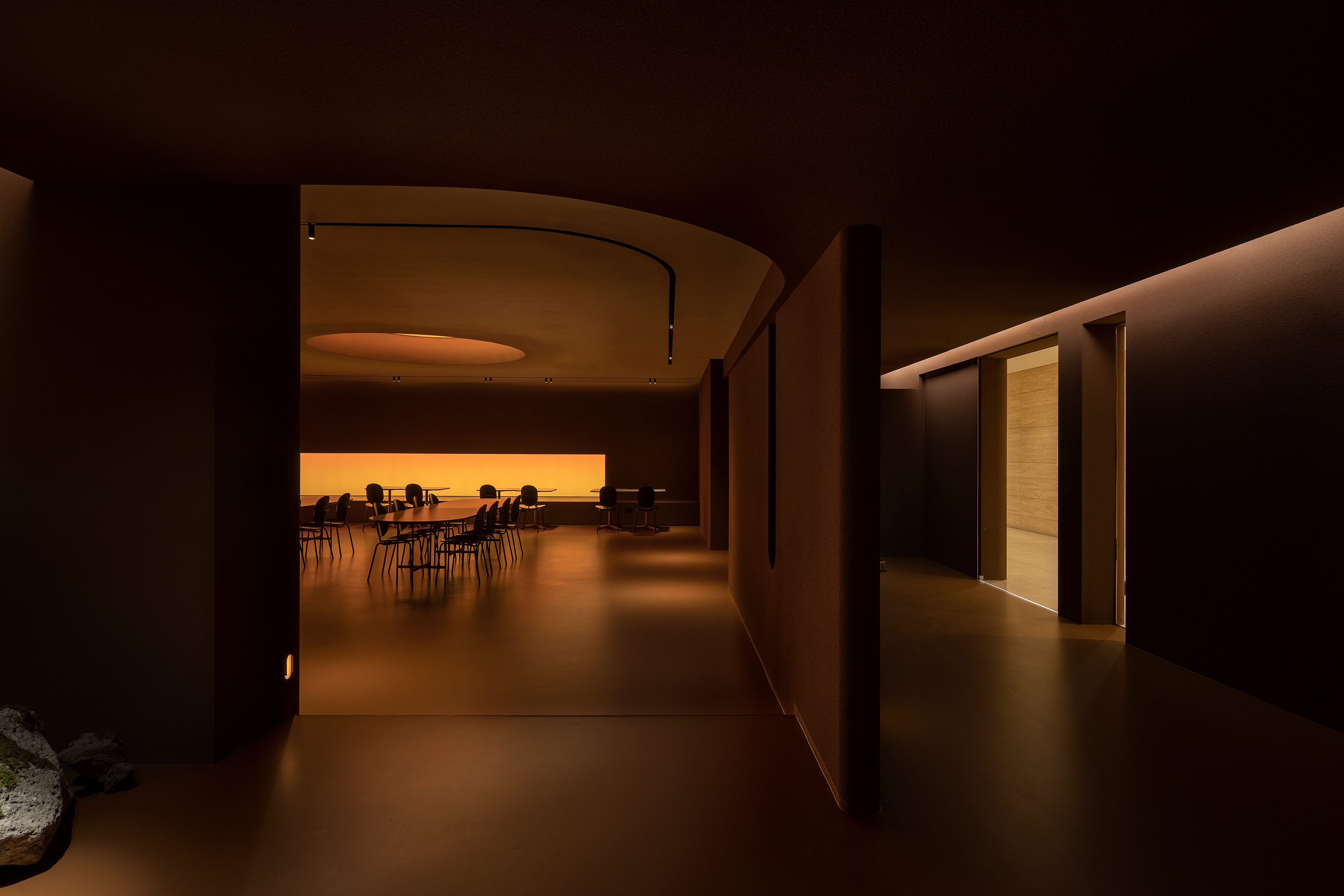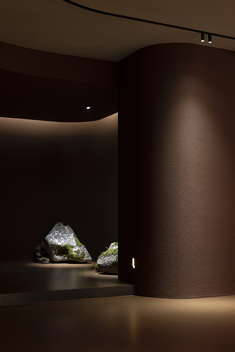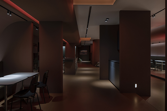 Cavelight, placed throughout the space, was planned to convert the space into a completely different space-time using an RGB lighting integration system with color control. The artificial lighting setting from dawn when the sun rises to sunset evening with the passage of time allowed the time zone to be recognized even without sunlight, and the subtle light gave a calm sensibility to create an immersive environment. This light has the potential to change to a flexible and dynamic atmosphere due to the reflection of the red rough walls, the floor with a slight luminosity, and the smooth ceiling, which can be changed for various events. The preceding factors were reckless but effective ways to completely change the way users spend their time here.
