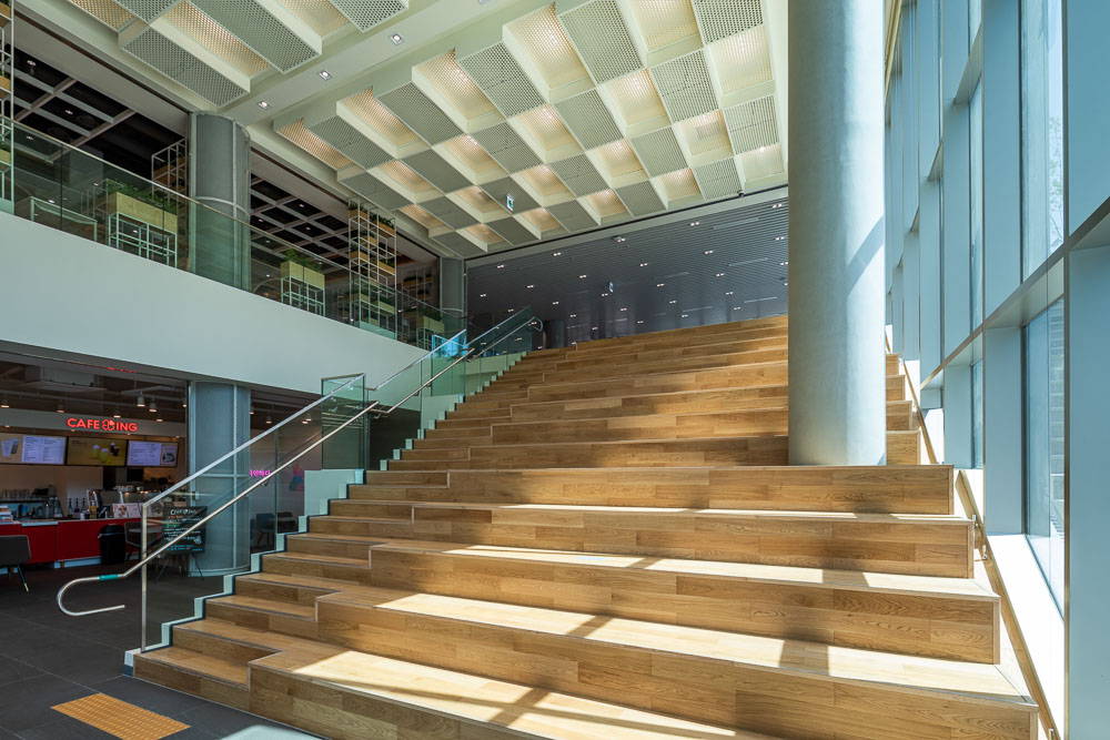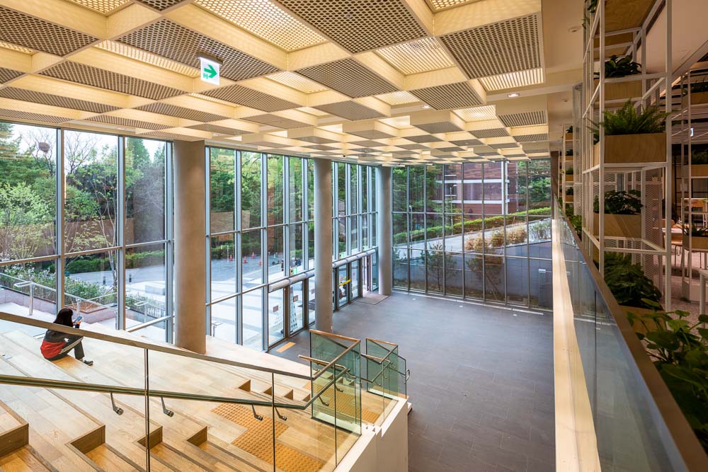 The architect efficiently organized the common space of the dormitory, planning the community lounge as the core space of the dormitory and allowing access from various directions of the campus. The open terraced lounge, which is planned across the main public space of the basement and first floors, has a high ceiling and a curtain wall that opens outward, giving a young, open and dynamic feeling. From here, going up the terraced lounge naturally leads to a multi-purpose meeting space where various exchanges and small gatherings of students take place. The residential space and gender-based spaces are not separated by separate masses, but divided by floors.
