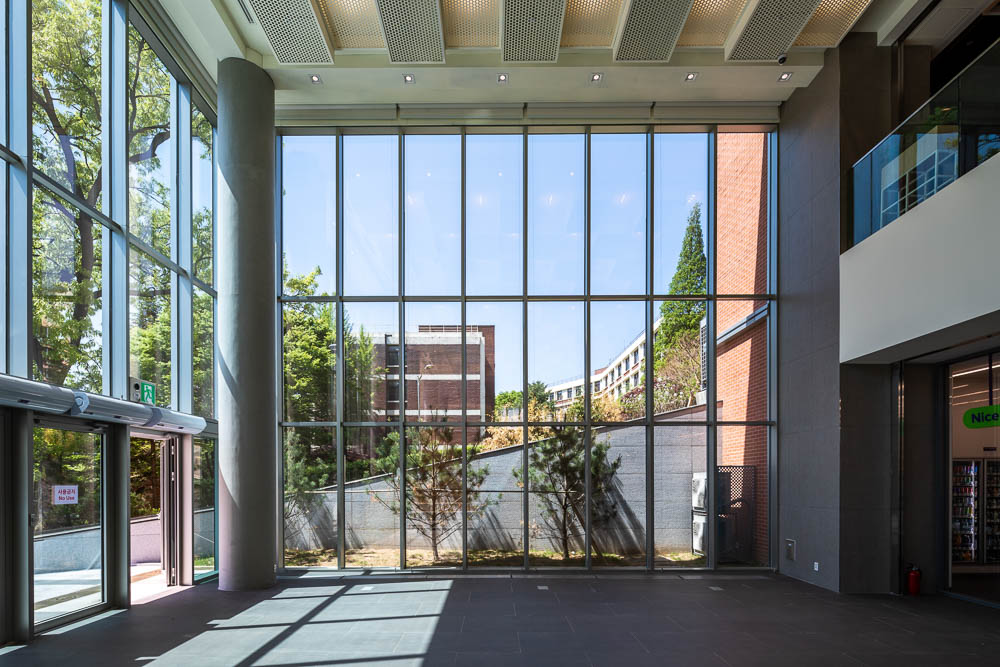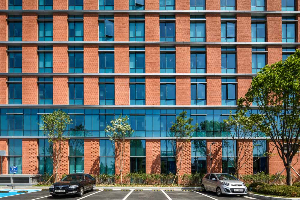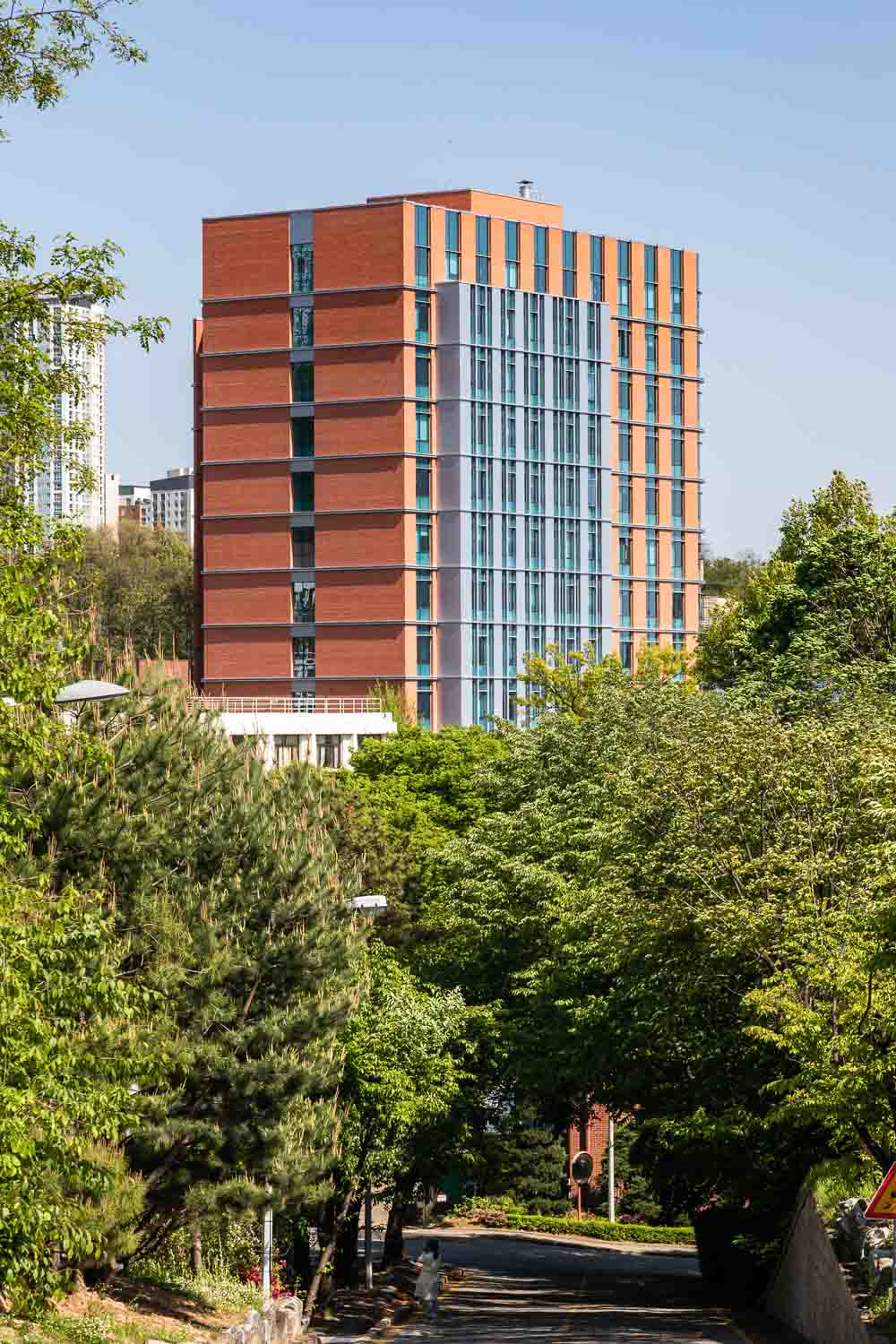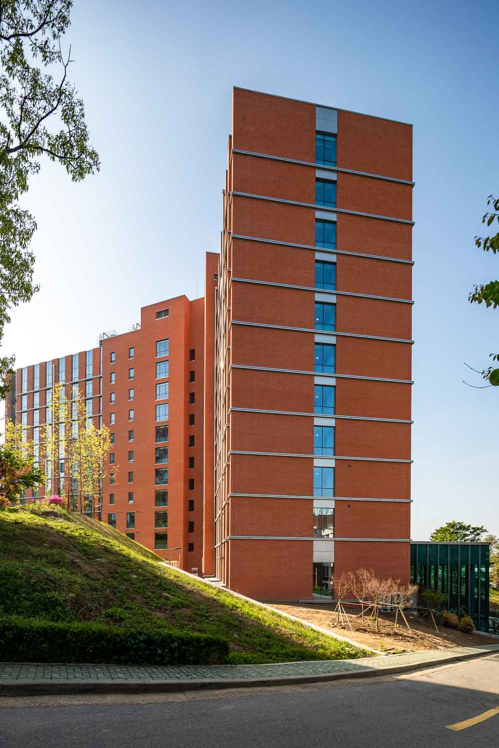 The exterior of Illsin Hall largely replicates the prototype of the International Studies Institute behind it. The architect meticulously refined the layout, shape, and floor plan to fit the program to accommodate twice that number. Thus, a plan bent by about 60 degrees is placed along the axes of two buildings and the topography of the campus, and the living areas are organized in groups on both sides of the platform and the lounge. The unit types are a single room, a double room, and a quadruple room, which are divided into corner type, extended type, and general type. A panoramic view of Suwon city beyond the campus can be viewed. The facade was completed by gathering the characteristic elements of the buildings on the Ajou University campus. The use of red bricks and bright silver aluminum is the result of much contemplation by the architect regarding the overall context of the campus. As an alternative to the weight felt in the brick mass composed of a rectangular punched window and horizontal ribbon window, a horizontal strip of aluminum protruding from the brick side divided by a vertical window was added. The earthy red bricks with natural and stable beauty creates a feeling of vitality in the dormitory that is a residential building, and the bright metallic aluminum finishes it with a refined language.