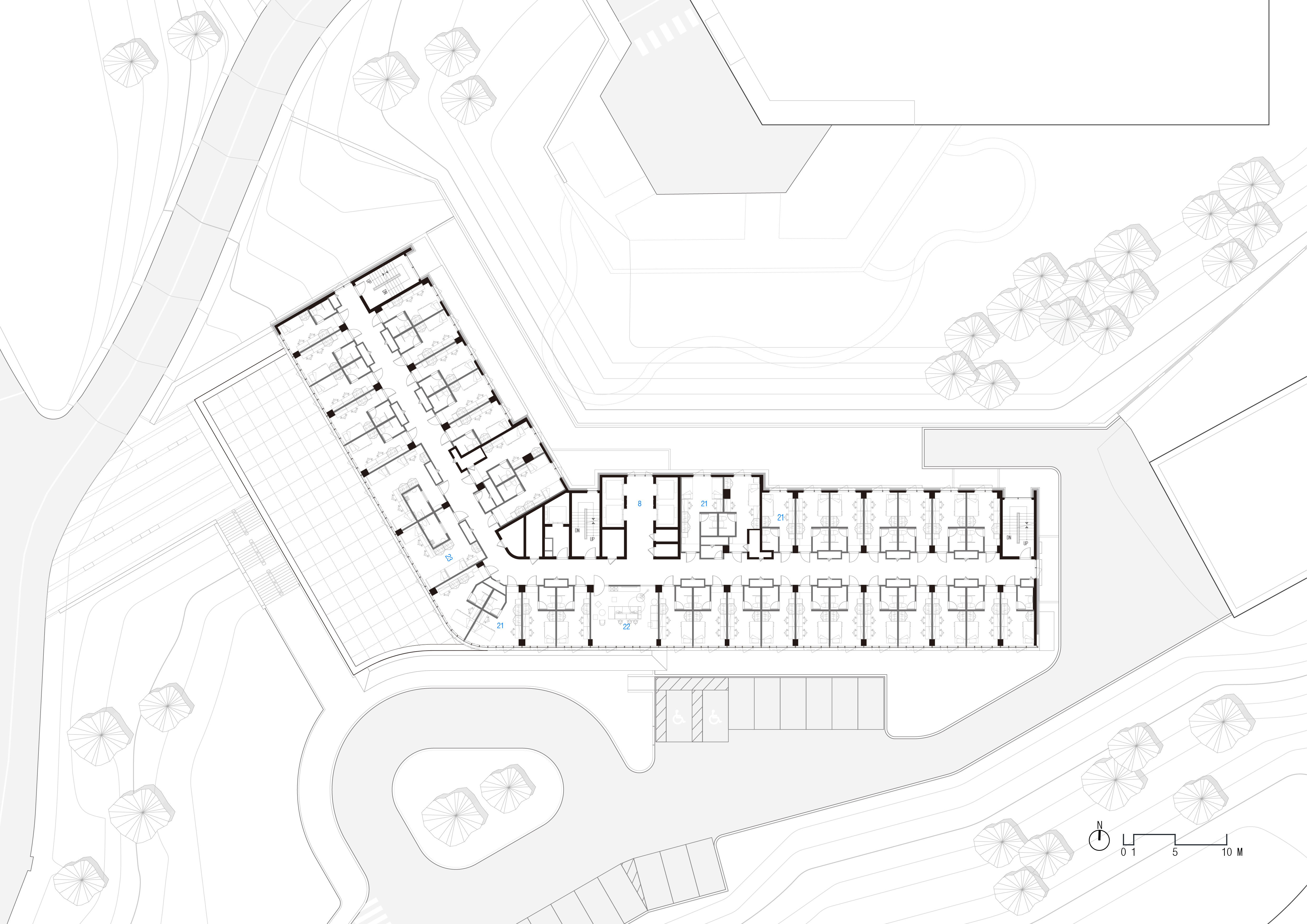 The architect efficiently organized the common space of the dormitory, planning the community lounge as the core space of the dormitory and allowing access from various directions of the campus. The open terraced lounge, which is planned across the main public space of the basement and first floors, has a high ceiling and a curtain wall that opens outward, giving a young, open and dynamic feeling. From here, going up the terraced lounge naturally leads to a multi-purpose meeting space where various exchanges and small gatherings of students take place. The residential space and gender-based spaces are not separated by separate masses, but divided by floors.