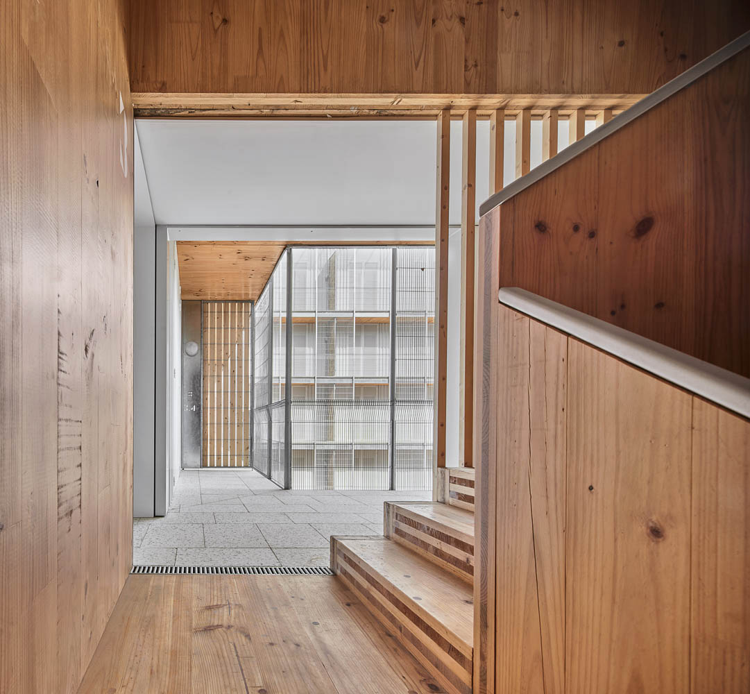 The size of the rooms, in addition to offering flexibility based on ambiguity of use and functional indeterminacy, allows an optimal structural space for the wooden structure. As this is social housing, to ensure economic viability the volume of wood required has been optimized to 0.24㎥ per square metre of built area.