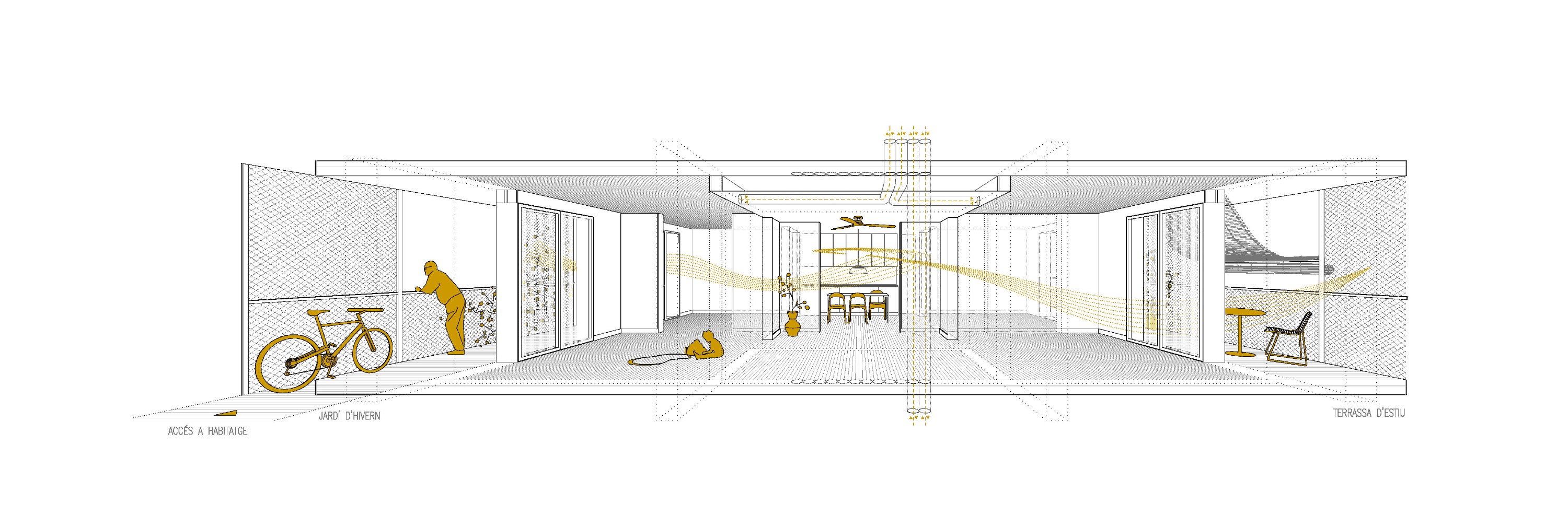 The homes consist of five or six modules, depending on whether they have two or three bedrooms. The inclusive, open-plan kitchen is located in the central room, acting as a distributor that replaces passages, while making domestic work visible and avoiding fixed gender roles.