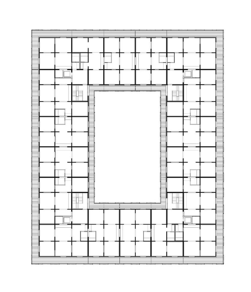 The building is organized around a courtyard that links a sequence of intermediate spaces. On the ground floor, a portico open to the city anticipates the doorway of the building and filters the relationship between public space and the communal courtyard that acts as a small plaza for the community. Instead of entering each of the building’s hallways directly and independently from the outer façade, the four communication shafts are located in the four corners of the courtyard, so that all the in habitants come together and meet in the courtyard-plaza. On the typical floor, access to the dwellings is via the private terraces that make up the ring of outdoor spaces overlooking the courtyard. The building’s general floor plan is organized by means of a layout of communicating rooms. There are 114 spaces per floor, 543 in the building, of similar dimensions, that eliminate private and communal passageways to make full use of the surface area. The server spaces are arranged in the central ring while the rest of the rooms, of undifferentiated uses and size, approximate 13㎡, run along the façade, presenting themselves to different forms of occupation. Another terrace in the outer ring completes the spatial sequence, the row of spaces interconnected by large openings, permeable to air, sight and movement.