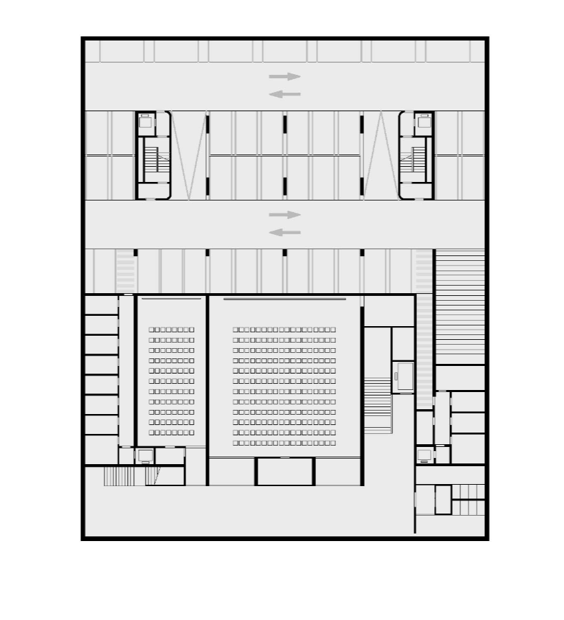 건물은 연속된 중간 공간을 연결하는 중정을 중심으로 구성됐다. 도시를 향해 열린 1층의 현관은 건물의 출입구가 어디인지 알 수 있도록 하며, 거리와 작은 광장의 역할을 하는 중정 사이를 연결하고, 여과하는 역할을 한다.