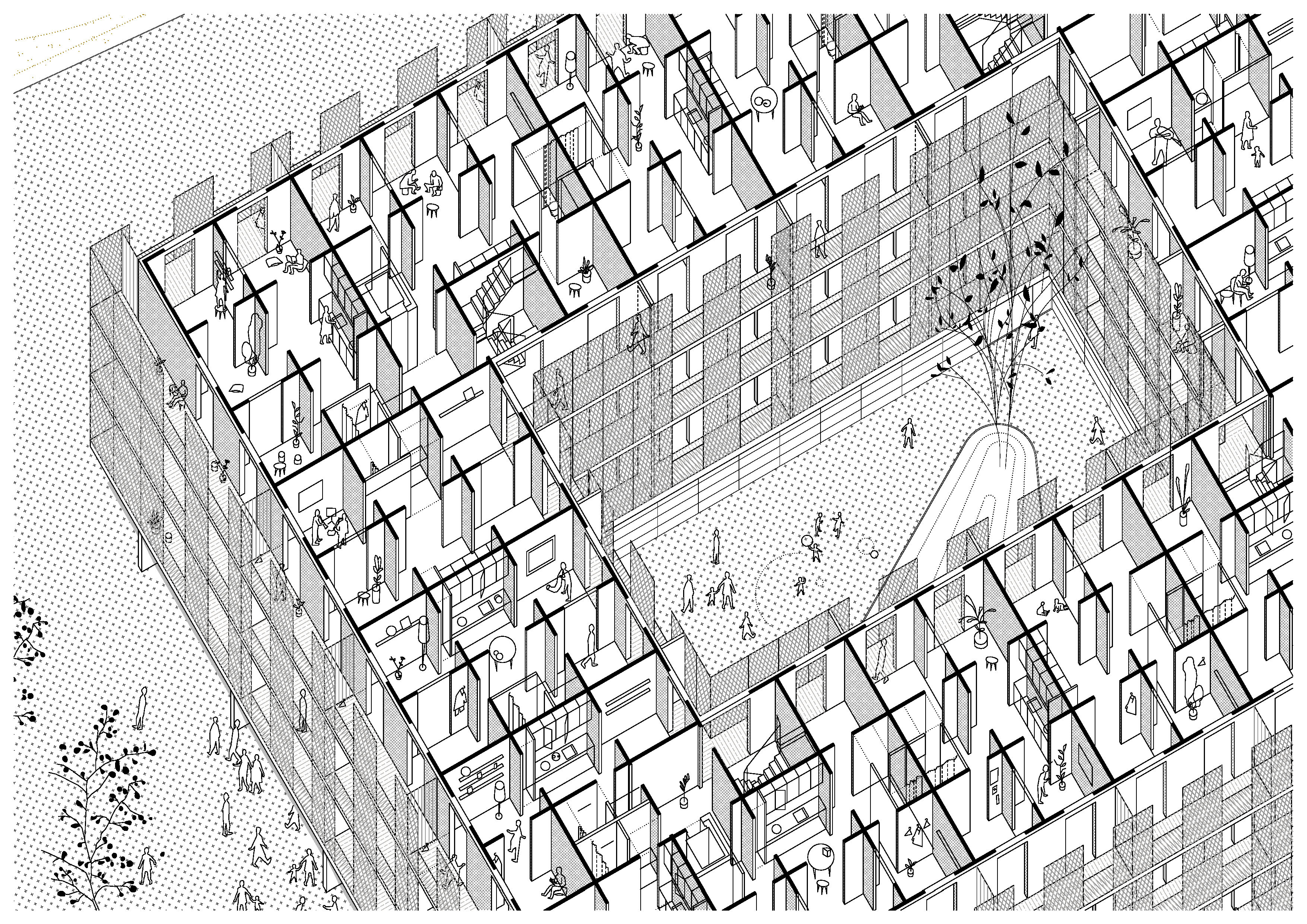 건물의 바깥에서 각 복도로 직접 출입하는 대신, 중정 모서리에 잇는 4개의 커뮤니케이션 통로를 통해 거주자들이 중정 광장에서 만날 수 있도록 했다. 대부분 층에는 중정이 내려다보이는 야외 공간의 개별 테라스를 통해 집으로 들어갈 수 있으며, 커뮤니케이션 룸이 있다. 층마다 114개, 총 543개의 비슷한 공간을 만들었고, 개인 및 공용 복도를 없애 최대한의 면적을 활용할 수 있도록 했다. 서버 공간은 중앙 링을 따라 놓여 있고, 입면을 따라 나열된 13㎡의 나머지 공간은 다양한 형태로 각자의 역할을 한다. 바깥 링에 있는 또 다른 테라스는 공기와 시야, 움직임이 그대로 전달되는 큰 창을 통해 연결되고 연속적인 공간을 완성한다.