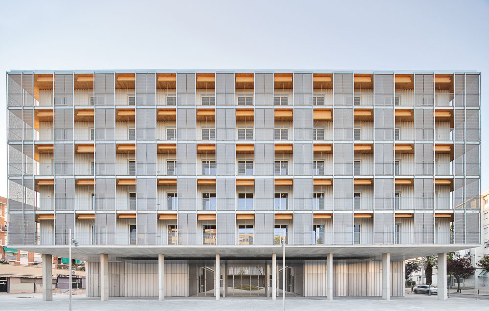 In 2017, Barcelona-based Peris+Toral Arquitectes won the ideas competition organized by AMB and promoted by the public body IMPSOL to design a project for 85 social housing units on the site formerly occupied by the iconic Pisa cinema in the Barcelona municipality of Cornellà de Llobregat. It is a freestanding residential building comprising five wood-framed floors supported by a reinforced concrete structure on the ground floor to accommodate shops and public facilities.