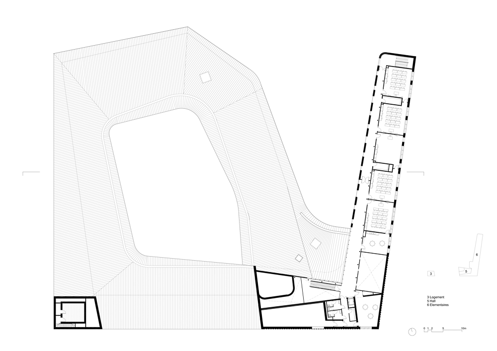 남쪽의 학교 단지 주 입구는 안뜰에 투명한 홀, 내부로 향하는 큰 개구부로 이어진다. 지면에서 1층까지의 규모이다. 학교의 크기는 도시의 풍경, 그리고 땅에 생기를 불어넣는 모습이며, 열린 공간이자, 도시의 전망을 바라보는 도시 랜드마크, 도시의 광장 역할을 하기도 한다. 광장의 연장선에는 초등학교와 공공 체육센터로 통하는 넓은 현관이 있다. 이는 볼륨과 조화롭게 통합된다. 석조 외관은 쿠브레의 전통적인 건물을 연상시킨다. 내부는 목조로 만들어져 있으며, 나선형과 지붕의 상호 작용을 주변 거리에서도 볼 수 있도록 공간이 열려있다.