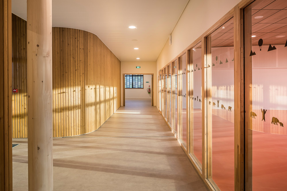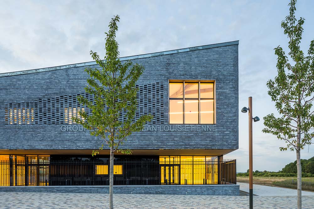 The school group is the very first element of a new district in the Coupvray ZAC. More than having to deal with the particular constraints of a site, the main challenge of this project was to create a public facility that would be the foundation and structure of this new area of the city. Thus the project makes the link with the existing and the nature while turning towards the great landscape. The school group expresses the town-country border by a distinct vocabulary between the urban facades and the heart of the building, a transition between the public and the private. It expresses the path of elevation that education brings with its spiral that rises towards the primary school, symbol of time and the progression of the rhythm of life. The new facility is visible, legible, friendly. In the continuous treatment of the three urban facades, variations are made according to whether they run along the forecourt or the side roads.