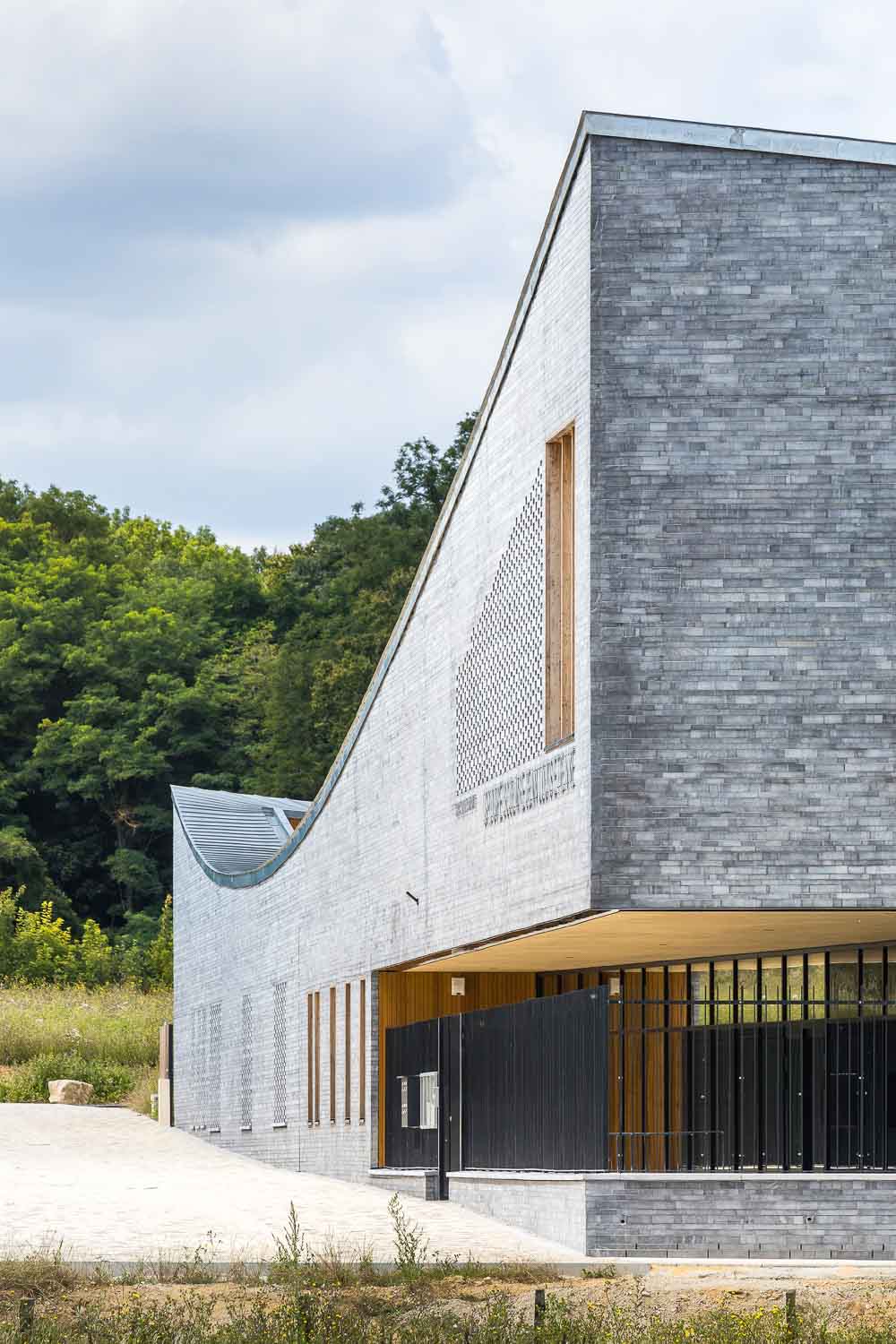 The main facade to the south has a large opening at hall level, which is transparent to the courtyards. The scale is graduated from the ground floor to the first floor. The modularity of the volume animates the plot in a rich urban facade, punctuated by transparencies, views and an urban landmark, the partial R+1 of the primary schools, at the corner of the square. The building creates the limits of the block. The vast access porch to the primary schools and the leisure centre is located in the extension of the square. It integrates harmoniously with the volume. The stone façade evokes the traditional buildings of Coupvray. Towards the town, the wooden joinery suggests an interior where the mineral is replaced by vegetation. Inside, the spiral and the interplay of the roofs can be seen from the street.