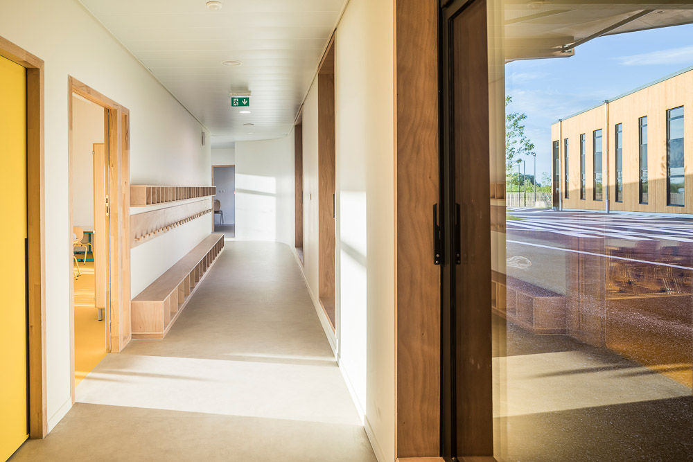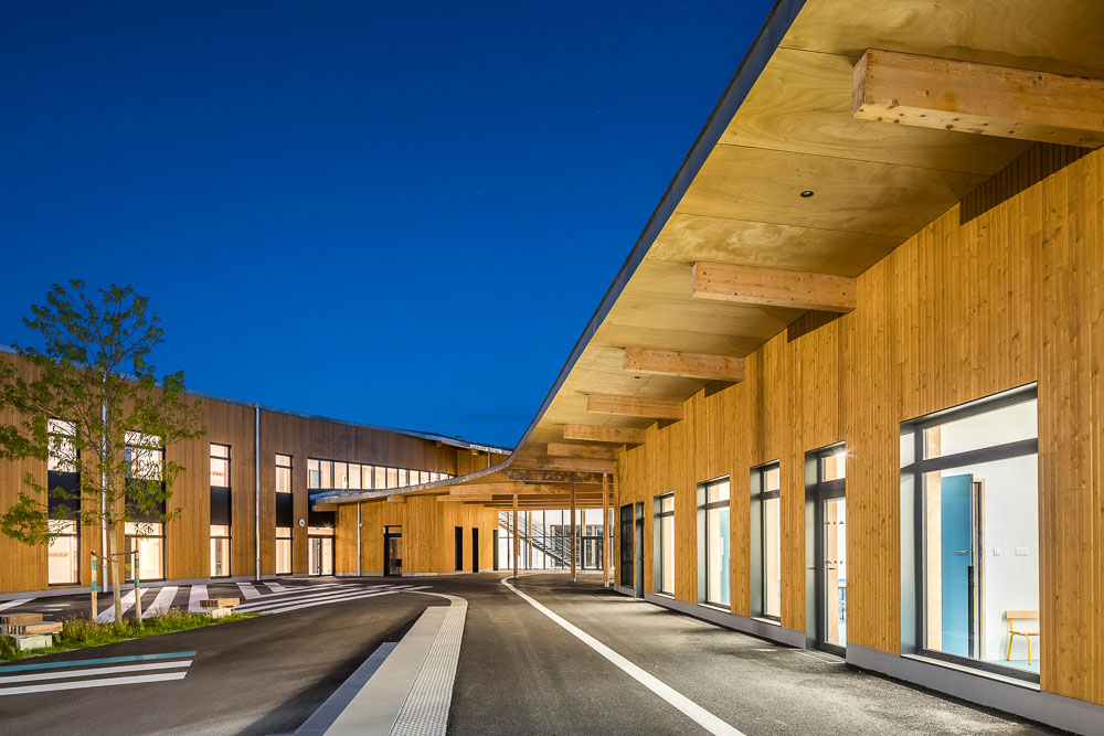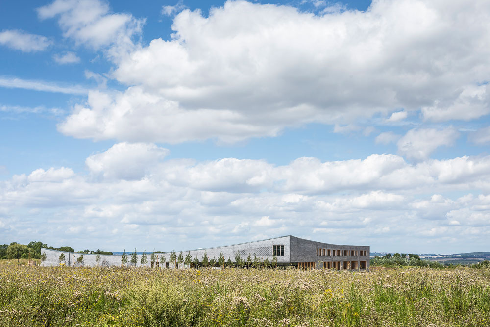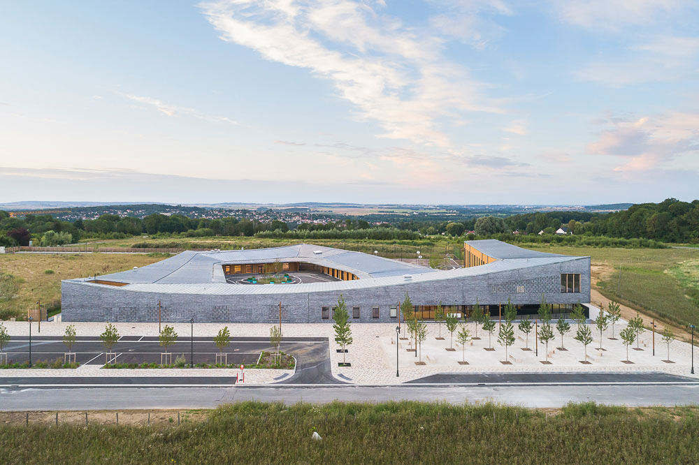 The school group is the very first element of a new district in the Coupvray ZAC. More than having to deal with the particular constraints of a site, the main challenge of this project was to create a public facility that would be the foundation and structure of this new area of the city. Thus the project makes the link with the existing and the nature while turning towards the great landscape. The school group expresses the town-country border by a distinct vocabulary between the urban facades and the heart of the building, a transition between the public and the private. It expresses the path of elevation that education brings with its spiral that rises towards the primary school, symbol of time and the progression of the rhythm of life. The new facility is visible, legible, friendly. In the continuous treatment of the three urban facades, variations are made according to whether they run along the forecourt or the side roads.