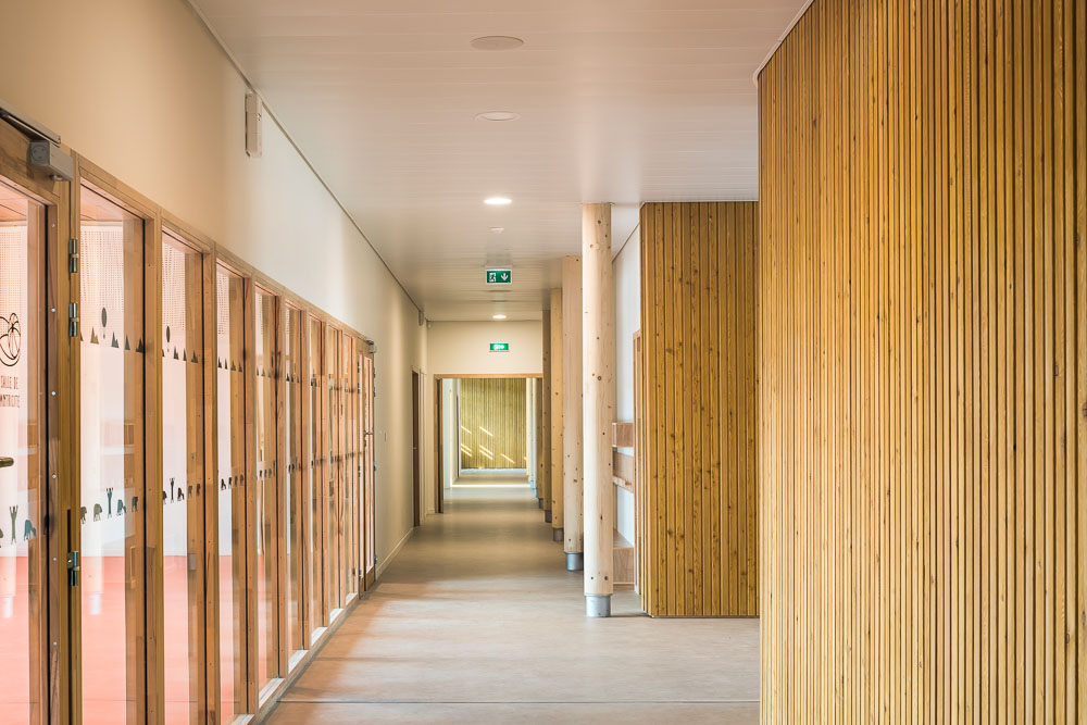 The main facade to the south has a large opening at hall level, which is transparent to the courtyards. The scale is graduated from the ground floor to the first floor. The modularity of the volume animates the plot in a rich urban facade, punctuated by transparencies, views and an urban landmark, the partial R+1 of the primary schools, at the corner of the square. The building creates the limits of the block. The vast access porch to the primary schools and the leisure centre is located in the extension of the square. It integrates harmoniously with the volume. The stone façade evokes the traditional buildings of Coupvray. Towards the town, the wooden joinery suggests an interior where the mineral is replaced by vegetation. Inside, the spiral and the interplay of the roofs can be seen from the street.