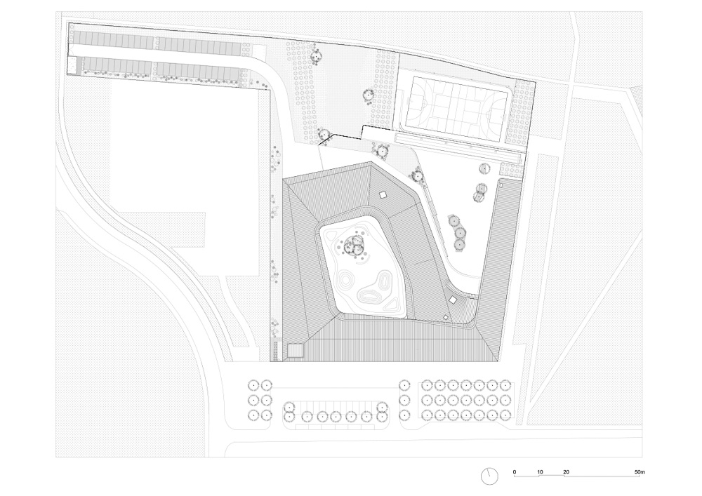 남쪽의 학교 단지 주 입구는 안뜰에 투명한 홀, 내부로 향하는 큰 개구부로 이어진다. 지면에서 1층까지의 규모이다. 학교의 크기는 도시의 풍경, 그리고 땅에 생기를 불어넣는 모습이며, 열린 공간이자, 도시의 전망을 바라보는 도시 랜드마크, 도시의 광장 역할을 하기도 한다. 광장의 연장선에는 초등학교와 공공 체육센터로 통하는 넓은 현관이 있다. 이는 볼륨과 조화롭게 통합된다. 석조 외관은 쿠브레의 전통적인 건물을 연상시킨다. 내부는 목조로 만들어져 있으며, 나선형과 지붕의 상호 작용을 주변 거리에서도 볼 수 있도록 공간이 열려있다.