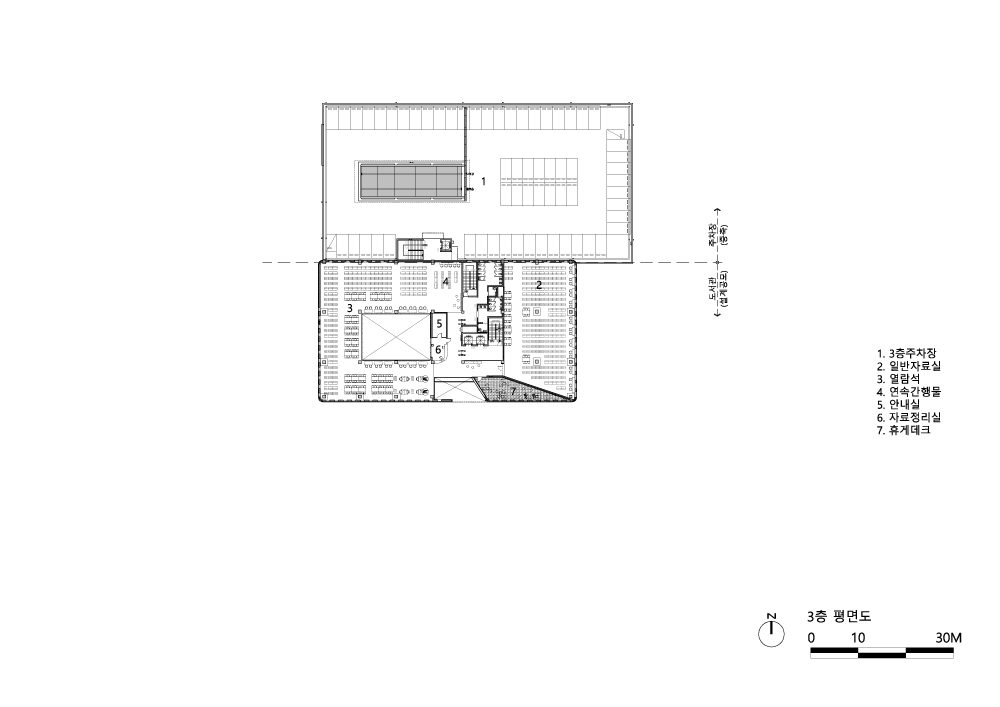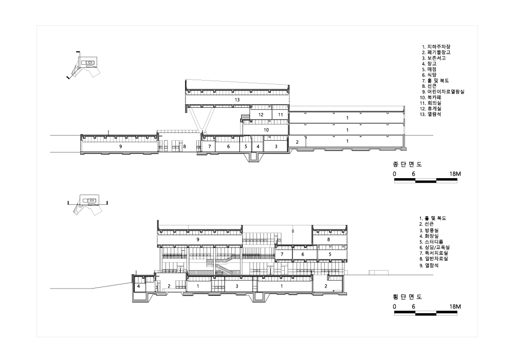 The first architectural strategy to be introduced on the wide empty site along the intersection’s corner part was securing the way to the library that crosses north-west and south-east directions. With this way to library, the residents are able to meet library in closer distance and enjoy the new pedestrian system accommodating moving flows of various purposes and manners. The pedestrian axis clearly imprinted on the ±0 ground level flows along the basement floor mass in free forms to create external spaces in different scales. The deep garden emerging from the external space, free planting plan, stand-type stairs with enough space to sit, and shady elements neutralize the boundary between library and road while creating more open and friendly external spaces.