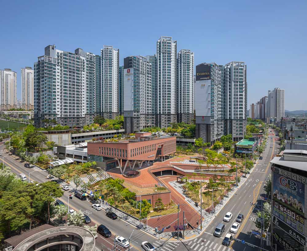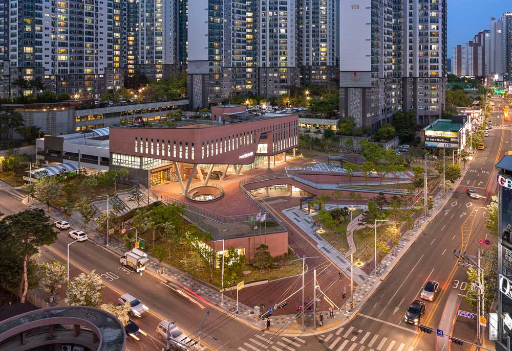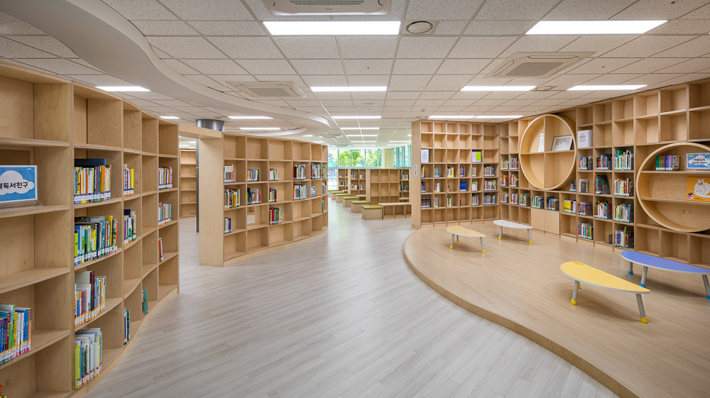 The library is located at the center of Yangpo District, Gumi. Yangpo is a new town rapidly growing by taking up over 50% of recent population influx. The city accommodates from 50,000 to 70,000 populations and the city’s image is dominated by the monotonous street covered with private capital-based commercial buildings and apartment houses just like other residential areas. Yangpo Library is located at the corner of the intersection that forms a boundary between residential district and commercial district. In addition to original features such as information delivery, learning, and center of community, the library is designed to present tension and relaxation to the inflexible streetscape to create a lively streetscape. The library design also considers about actively opening the external space to residents so that residents would feel friendly with the library.