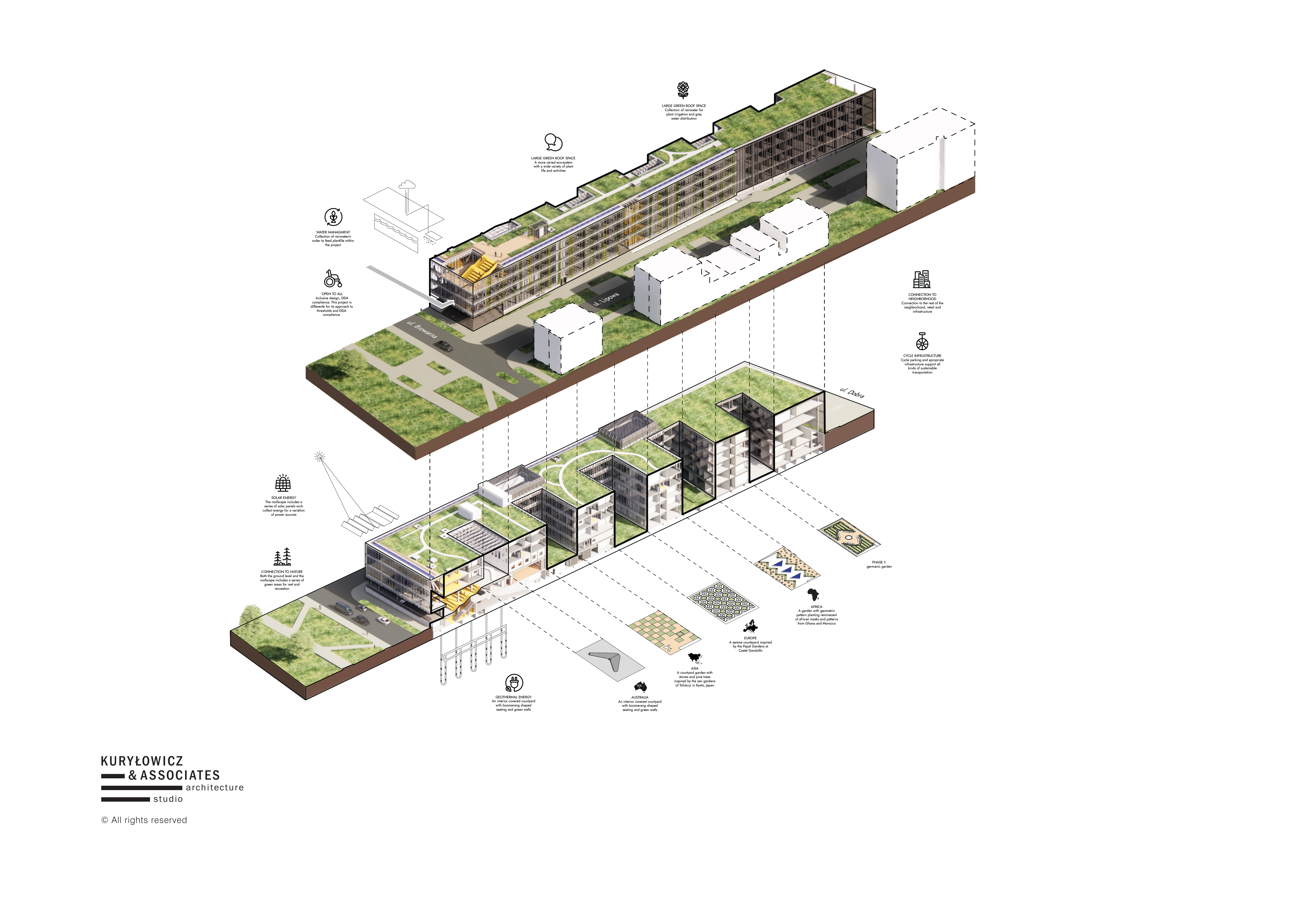Embracing the university by connecting the main campus with the riverside neighborhood and its much-loved library, the transparent facade opens the building up to its immediate neighborhood and its surrounding nature. Its Wislana street elevation with a shimmering glazed skin, which exposes its concrete structure and which is punctured by a series of courtyards, the design bursts with communal energy.