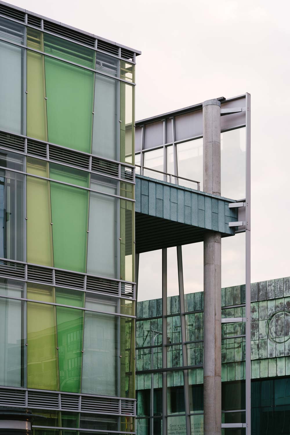 The architecture of the Modern Languages and Applied Linguistics building is based on lightness, with a refined framework of steel, concrete and glass. The building plays a game consisting of blurring the tangible boundaries of its mass and rendering superfluous the reading of a single solid volume into something more poetic.