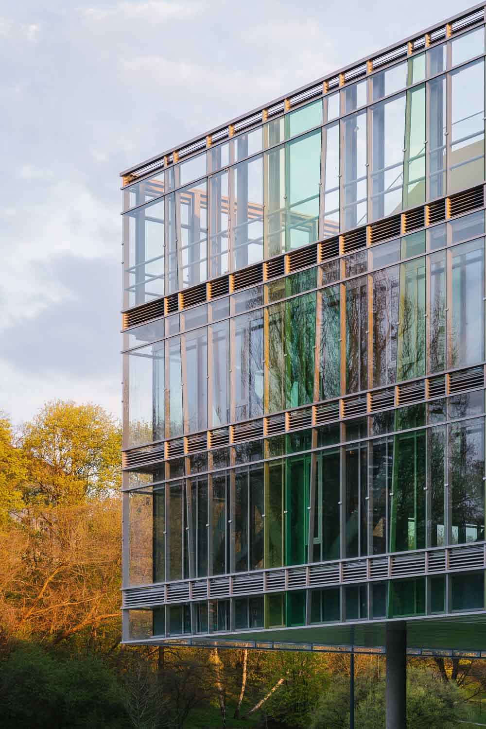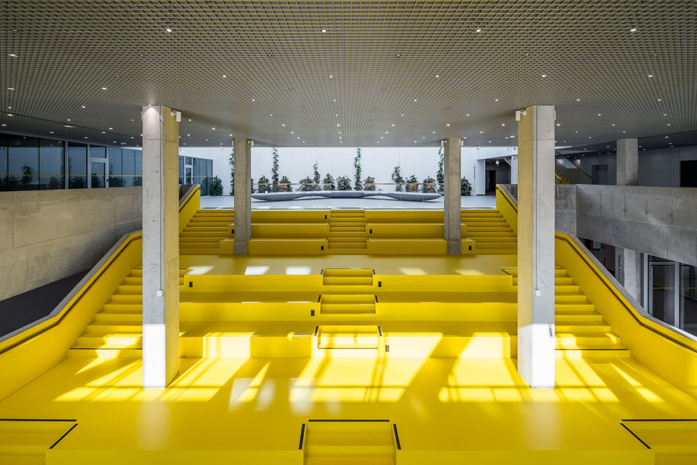 Embracing the university by connecting the main campus with the riverside neighborhood and its much-loved library, the transparent facade opens the building up to its immediate neighborhood and its surrounding nature. Its Wislana street elevation with a shimmering glazed skin, which exposes its concrete structure and which is punctured by a series of courtyards, the design bursts with communal energy.