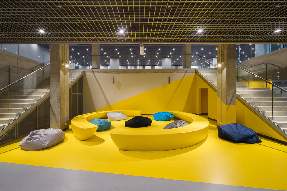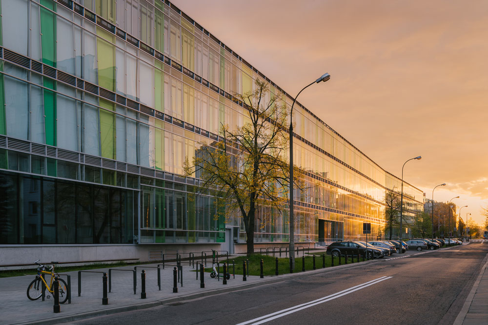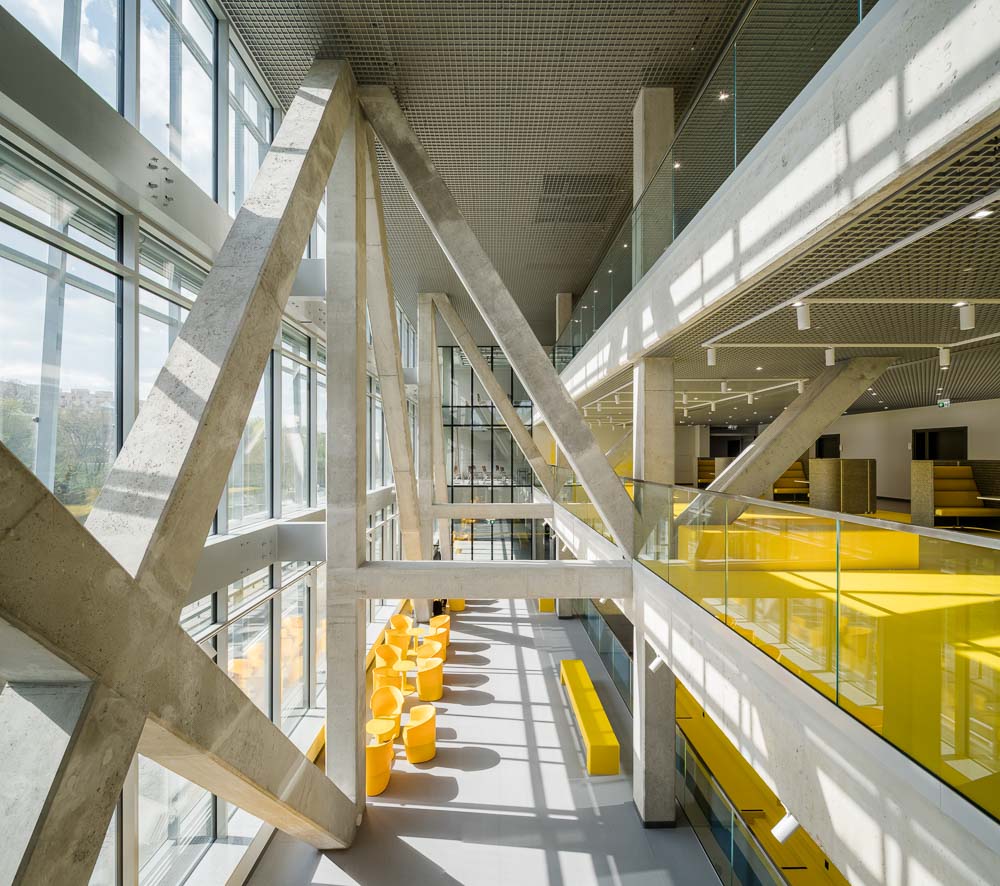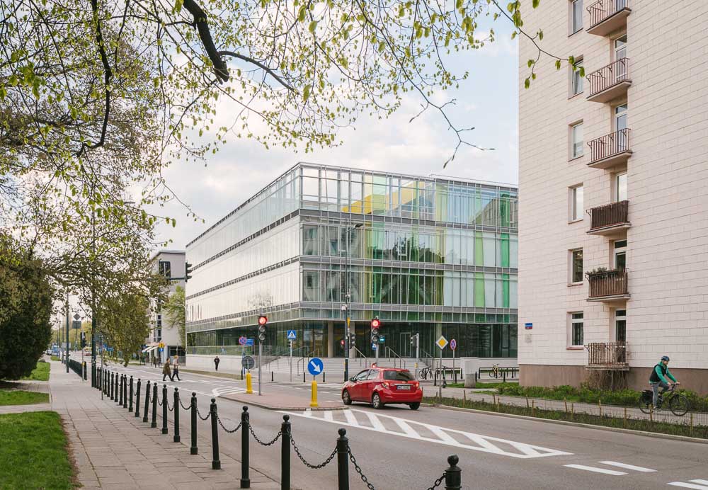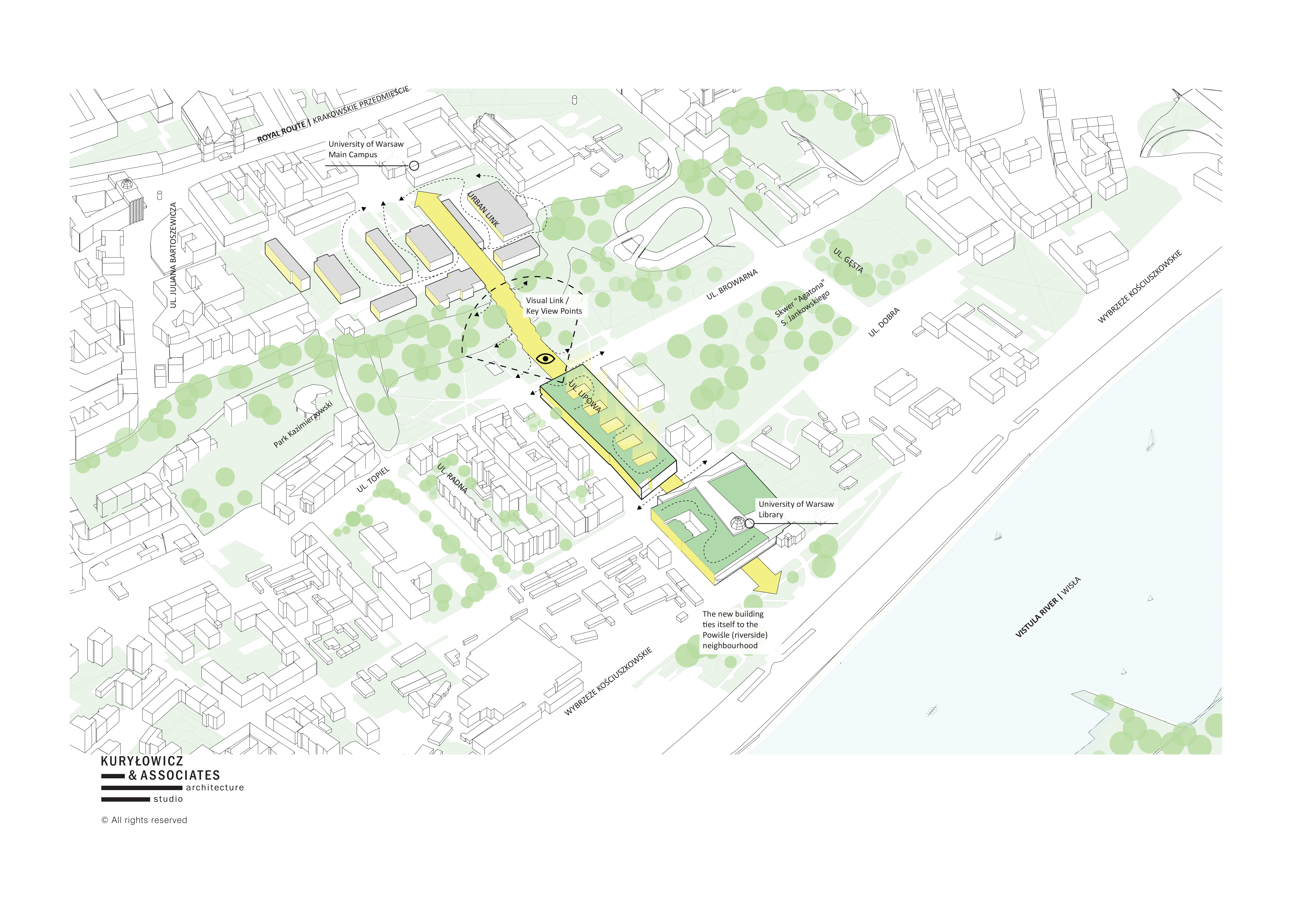 메인 캠퍼스와 강변의 동네 그리고 많은 사랑을 받는 도서관을 연결했고, 건물의 투명한 입면은 이웃과 자연을 향해 열리게 했다. 비슬라나(Wislana) 거리를 향한 반짝이는 유리 입면은 콘크리트 구조를 드러내고, 연속해서 비워진 중정 디자인은 공동의 에너지를 증폭시킨다.